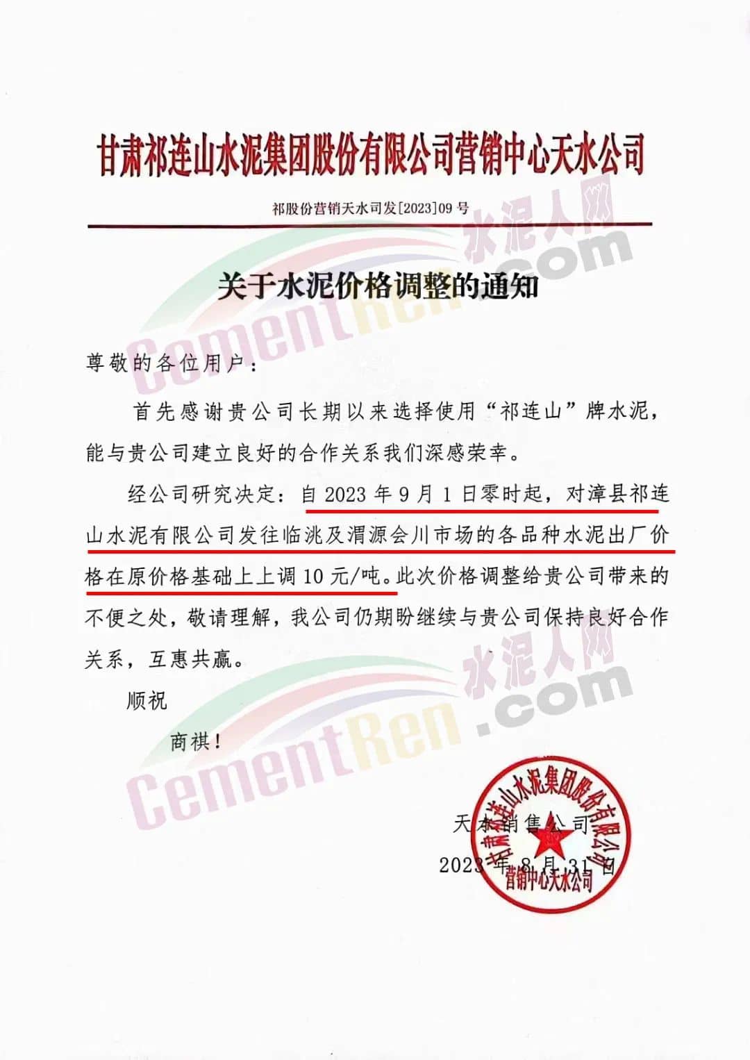 甘肅祁連山水泥集團股份有限公司營銷中心天水公司通知,經公司研究決定:自2023年9月1日零時起,對漳縣祁連山水泥有限公司發往臨洮及渭源會川市場的各品種水泥出廠價格在原價格基礎上上調10元/噸。