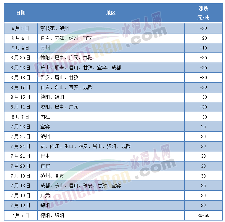 7月份,四川宜賓、綿陽等多個區域主要品牌水泥企業連續兩至三次通知上調水泥價格,累計上調50~90元/噸;德陽、瀘州、自貢、樂山、眉山、雅安、成都等區域主要品牌企業連續兩次通知上調水泥價格,累計上調60元/噸。