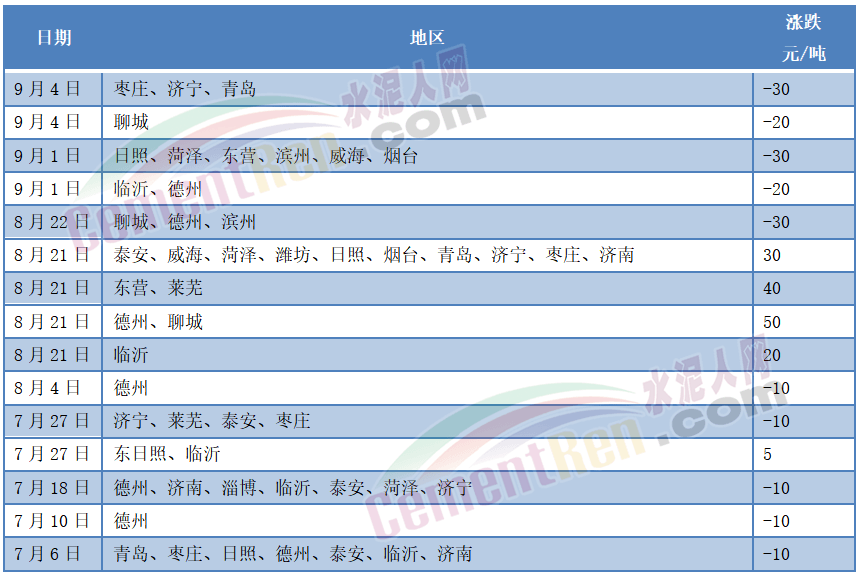 8月20前后,山東省主要品牌企業通知上調水泥報價30-50元/噸,個別企業因前期報價相對較低,為調整差價,掛牌報價一次性上調90-100元/噸。