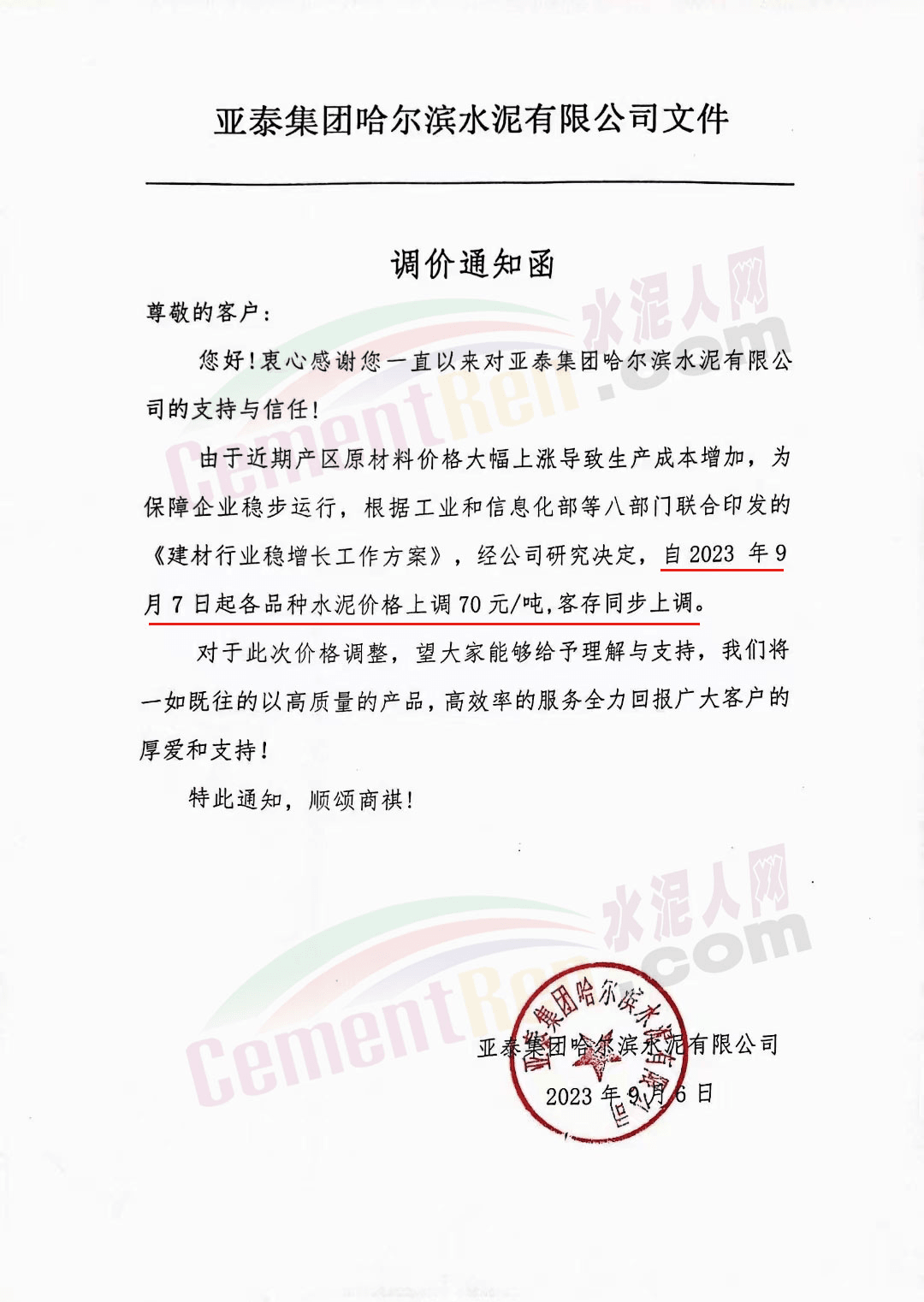 日前,亞泰集團哈爾濱水泥有限公司通知,由于近期產區原材料價格大幅上漲導致生產成本增加,為保障企業穩步運行,根據工業和信息化部等八部門聯合印發的《建材行業穩增長工作方案》,經公司研究決定,自2023年9月7日起各品種水泥價格上調70元/噸,客存同步上調。