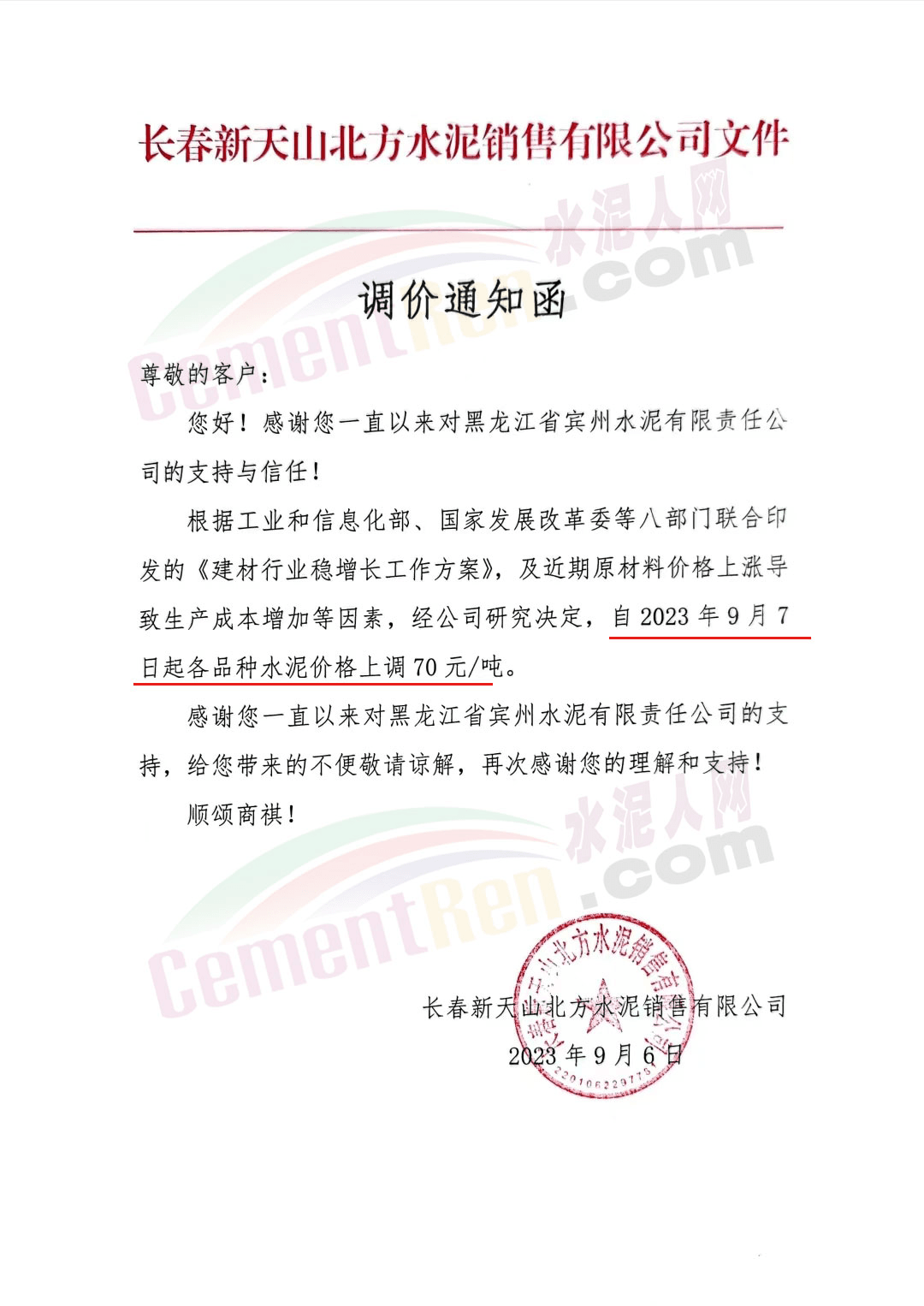 長春新天山北方水泥銷售有限公司通知,根據工業和信息化部、國家發展改革委等八部門聯合印發的《建材行業穩增長工作方案》,及近期原材料價格上漲導致生產成本增加等因素,經公司研究決定,自2023年9月7日起各品種水泥價格上調70元/噸。