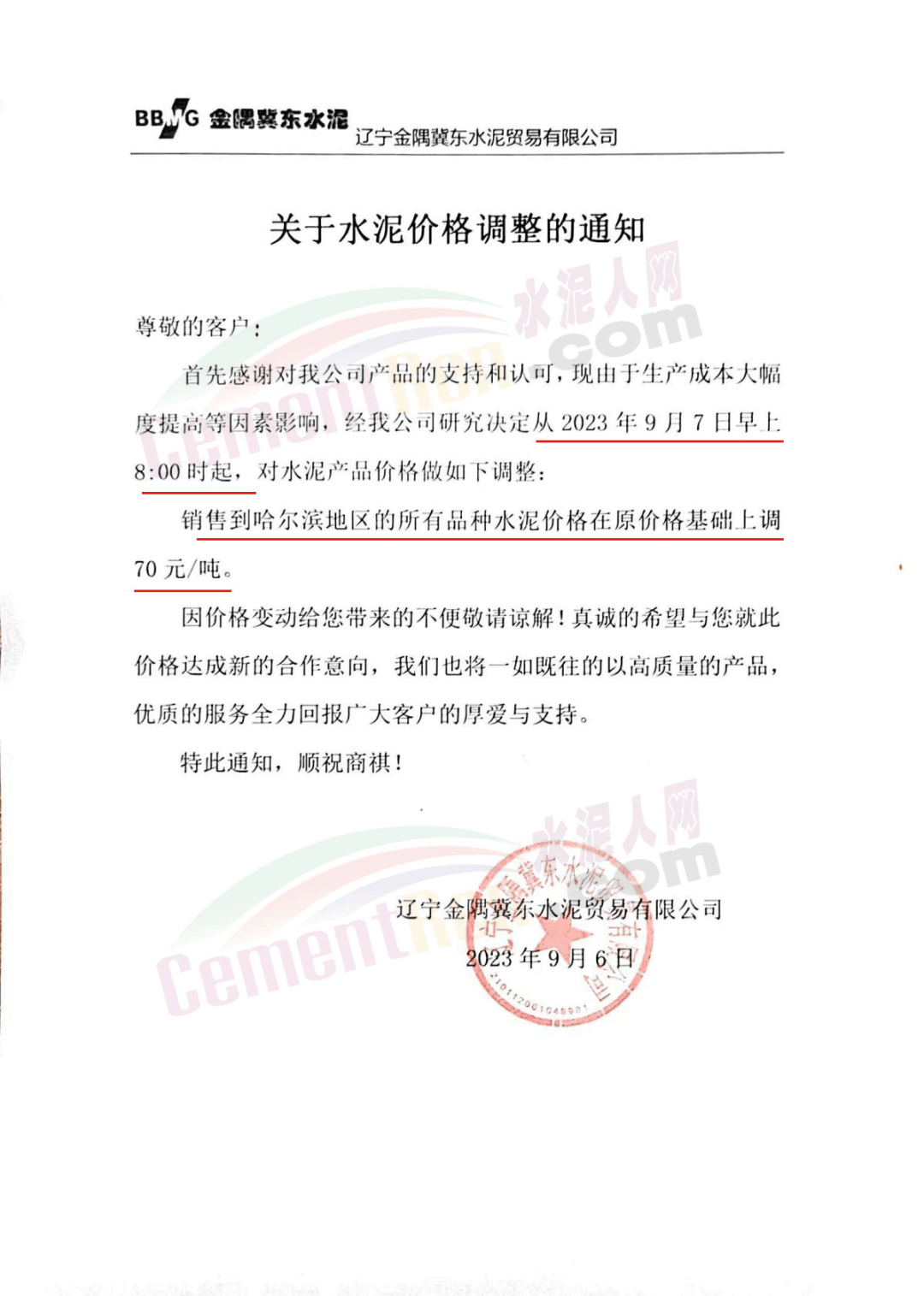 遼寧金隅冀東水泥貿易有限公司通知,由于生產成本大幅度提高等因素影響,經公司研究決定從2023年9月7日早上8時起,對銷售到哈爾濱地區的所有品種水泥價格在原價格基礎上上調70元/噸。