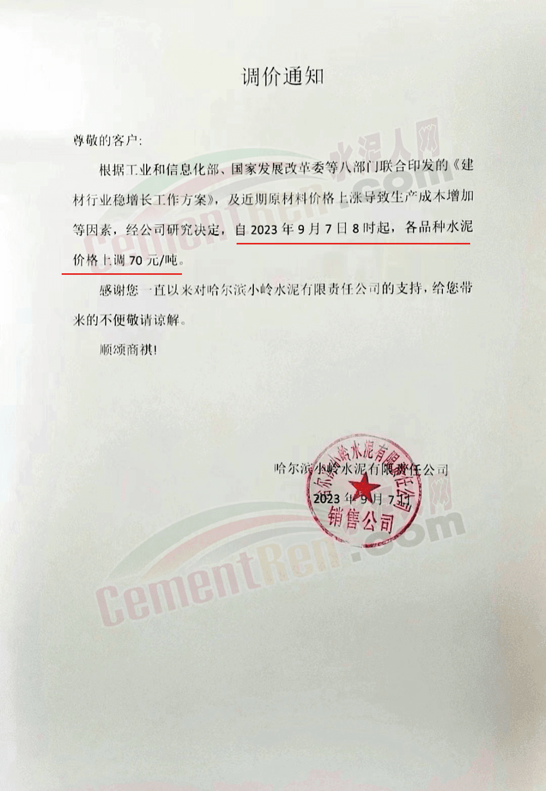 哈爾濱小嶺水泥有限責任公司通知,根據工業和信息化部、國家發展改革委等八部門聯合印發的《建材行業穩增長工作方案》,及近期原材料價格上漲導致生產成本增加等因素,經公司研究決定,自2023年9月7日8時起,各品種水泥價格上調70元/噸。