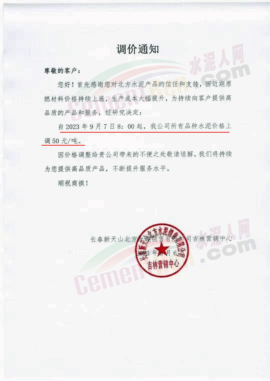 長春新天山北方水泥銷售有限公司吉林營銷中心通知,因近期原燃材料價格持續上漲,生產成本大幅提升,為持續向客戶提供高品質的產品和服務,經研究決定:自2023年9月7日8時起,公司所有品種水泥價格上調50元/噸。