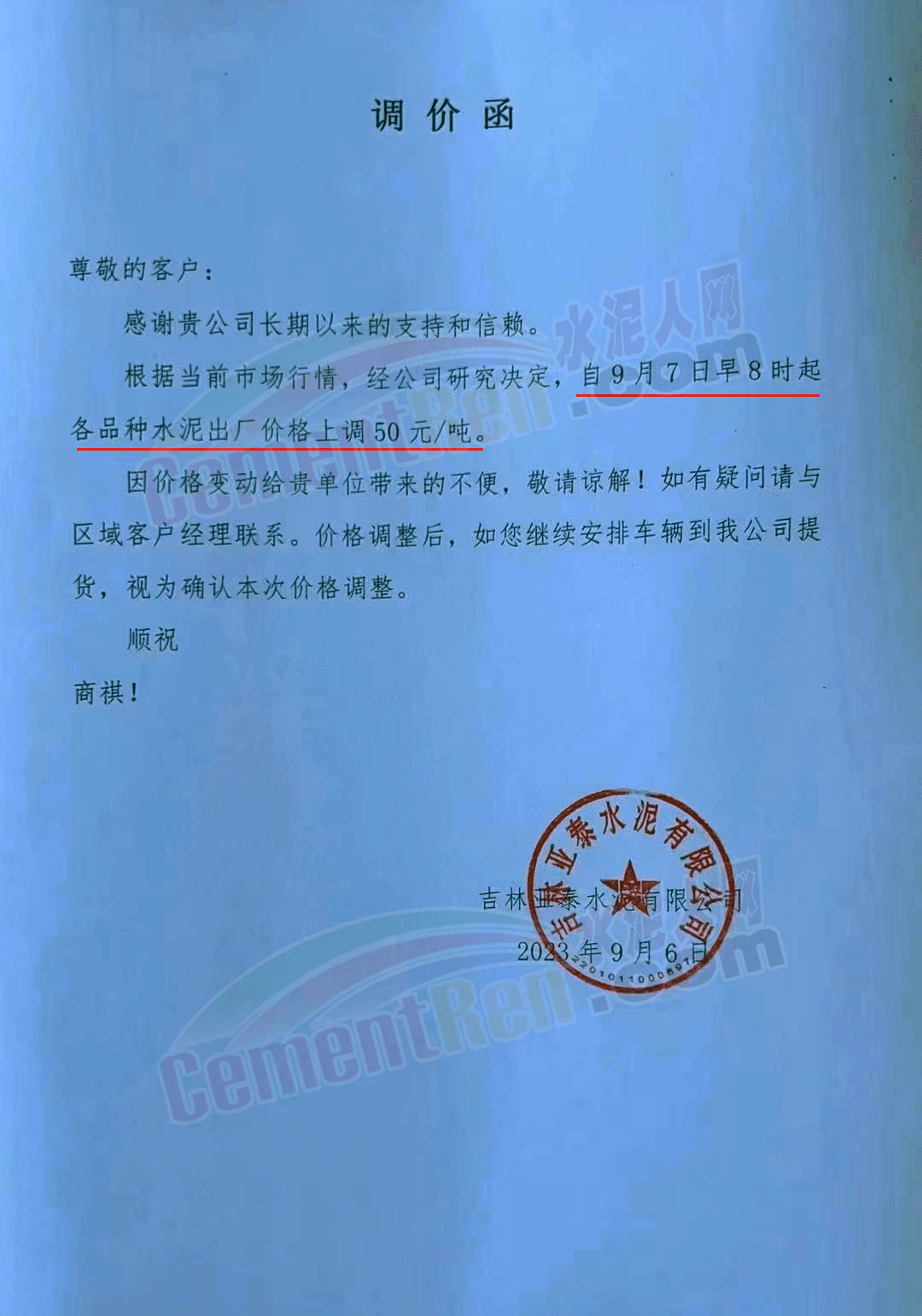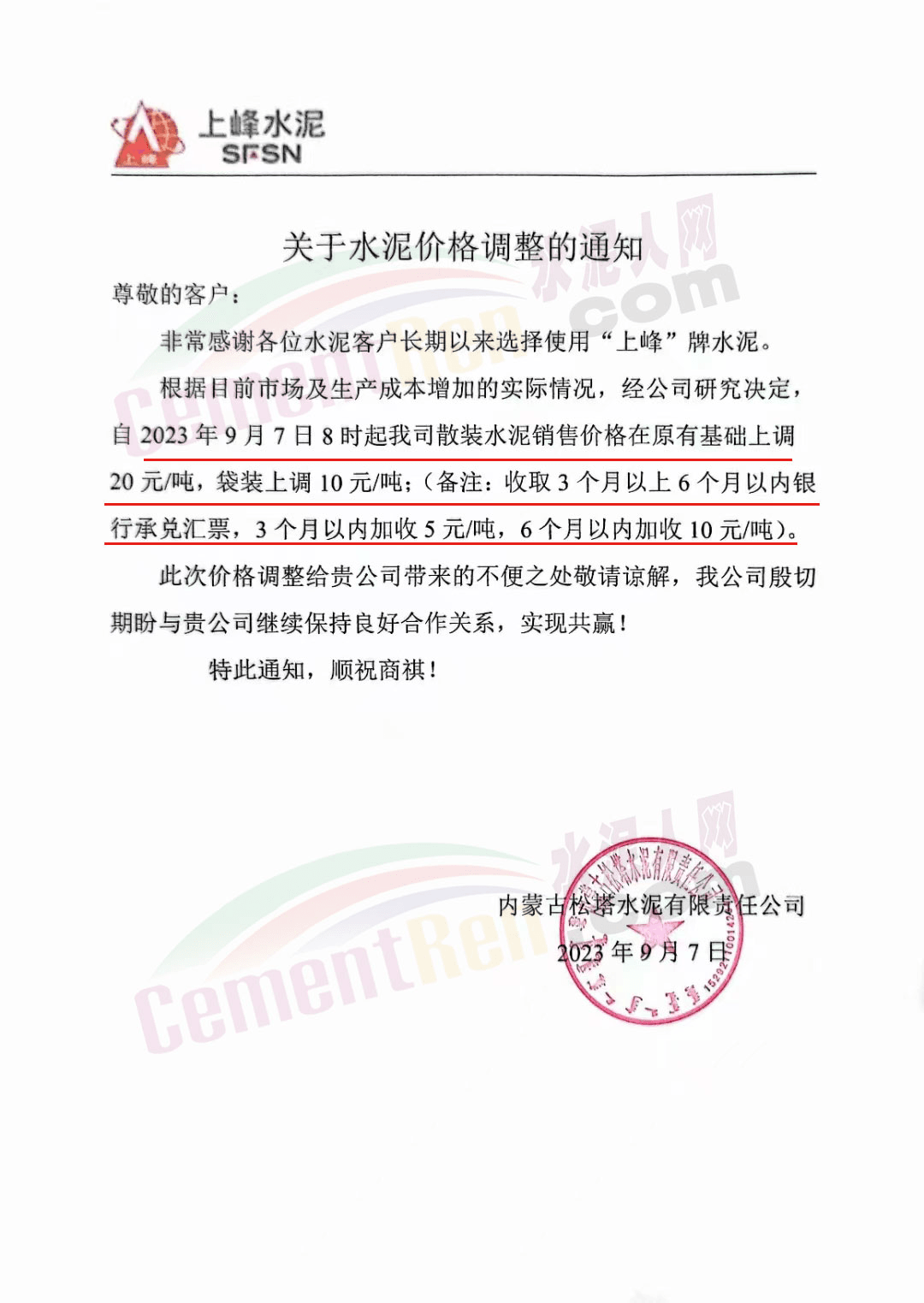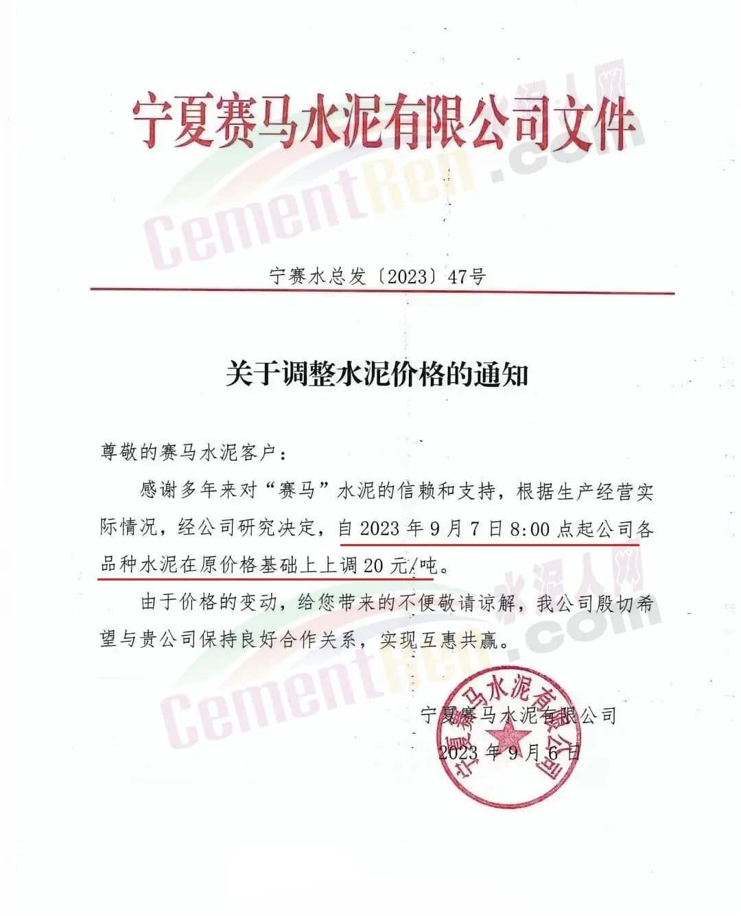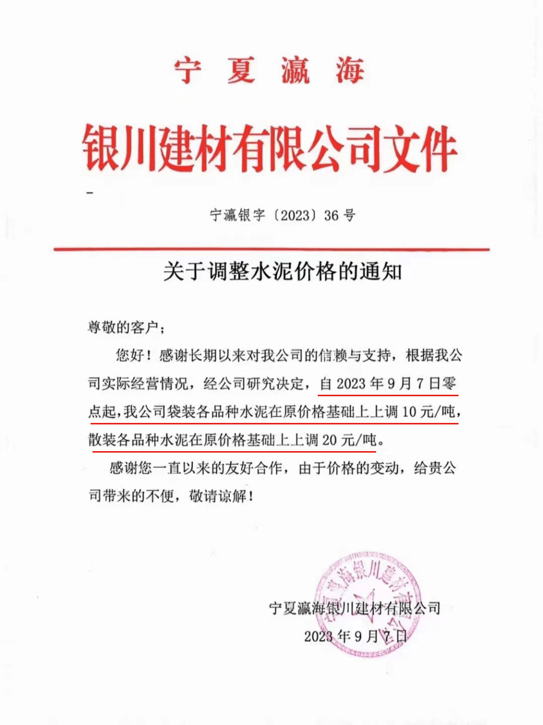 寧夏瀛海天琛建材有限公司通知,根據公司實際經營情況,公司決定,自2023年9月7日零點起,各品種水泥在原價格基礎上上調20元/噸。