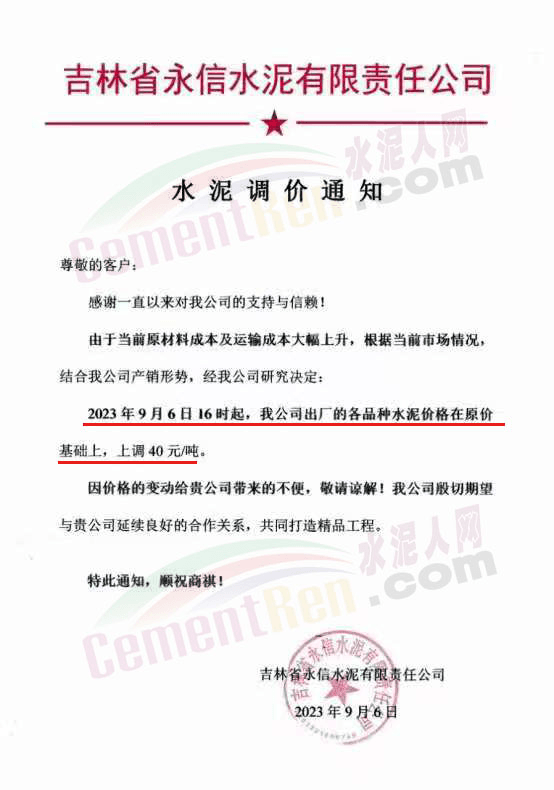 吉林省永信水泥有限責任公司通知由于當前原材料成本及運輸成本大幅上升,根據當前市場情況,結合公司產銷形勢,經研究決定:2023年9月6日16時起,公司出廠的各品種水泥價格在原價基礎上,上調40元/噸。