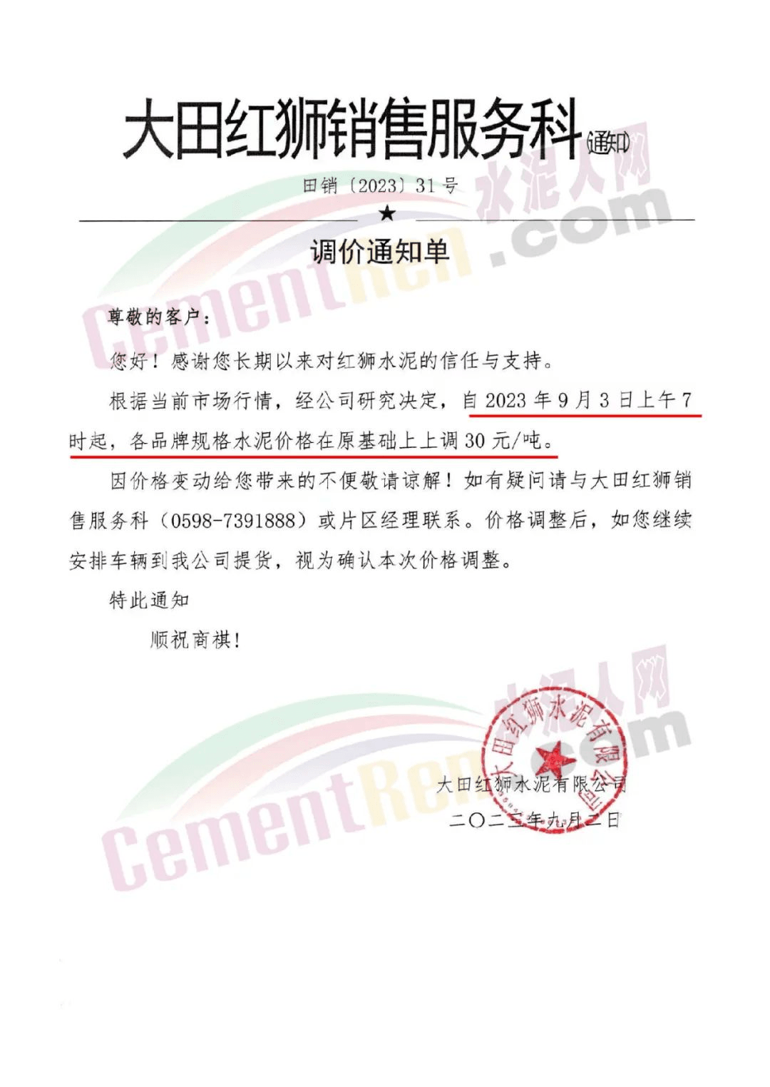 紅獅水泥旗下漳州紫金水泥、龍海紅獅、大田紅獅銷售服務科通知,根據當前市場行情,經公司研究決定,自2023年9月3日上午7時起,各品牌各規格品種水泥價格在原基礎上上調30元/噸。