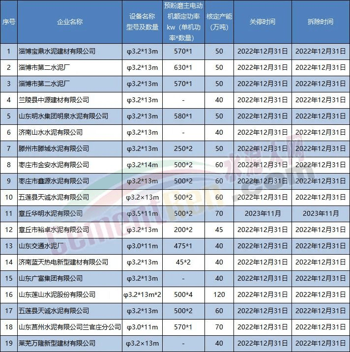 據(jù)水泥人網(wǎng)不完全統(tǒng)計,今年1-7月,山東省公告用于置換或補齊產(chǎn)能退出的粉磨生產(chǎn)線共20條,關(guān)停拆除時間多在2022年12月31日。