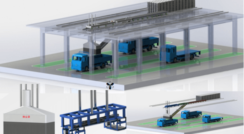 該系統涉及水泥行業中袋裝水泥智能裝車環節,是適應市場需要的新產品,水泥從包裝機后端的輸送帶運出來,通過該系統自動裝車,全程不需人工介入。