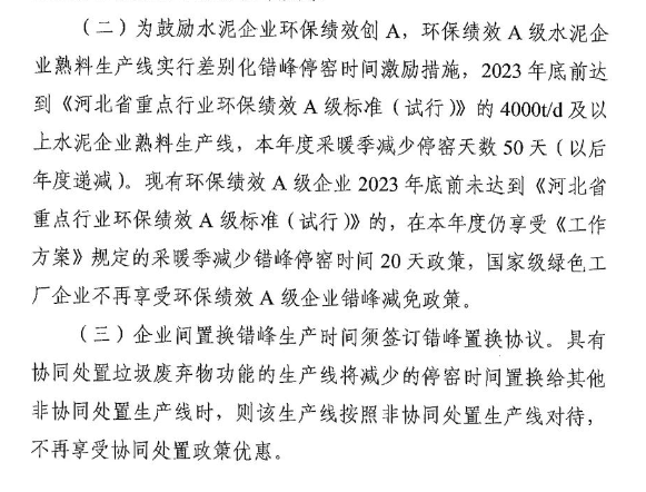 在2023年底前達(dá)A級(jí)標(biāo)準(zhǔn)的企業(yè)不僅要停窯,而且減免措施僅限擁有4000t/d及以上企業(yè);國家級(jí)綠色工廠不再享受錯(cuò)峰減免政策。調(diào)整錯(cuò)峰生產(chǎn)時(shí)間和保民生的協(xié)同處置項(xiàng)目也必須在規(guī)定的時(shí)間段內(nèi)補(bǔ)齊等。