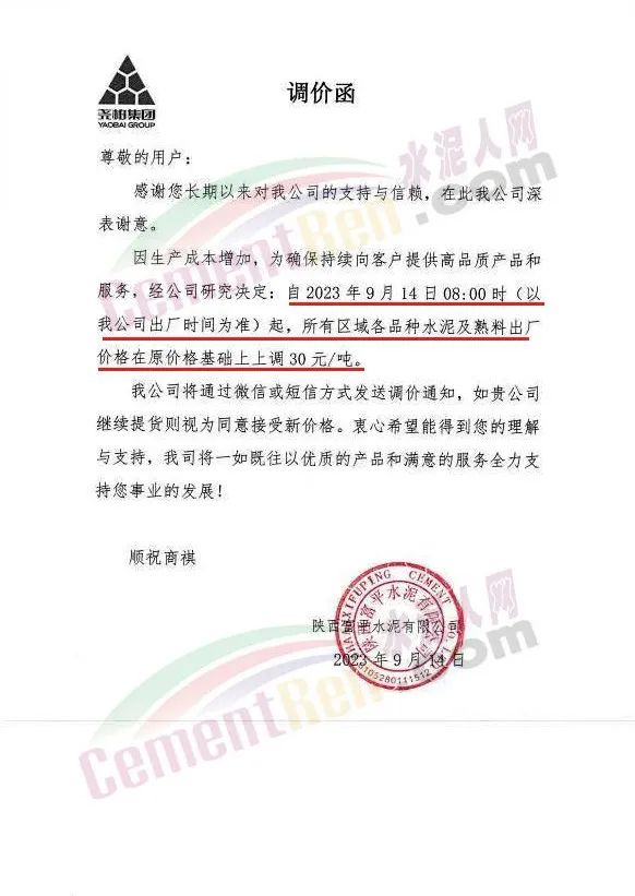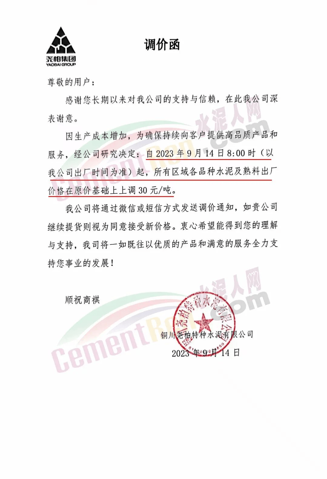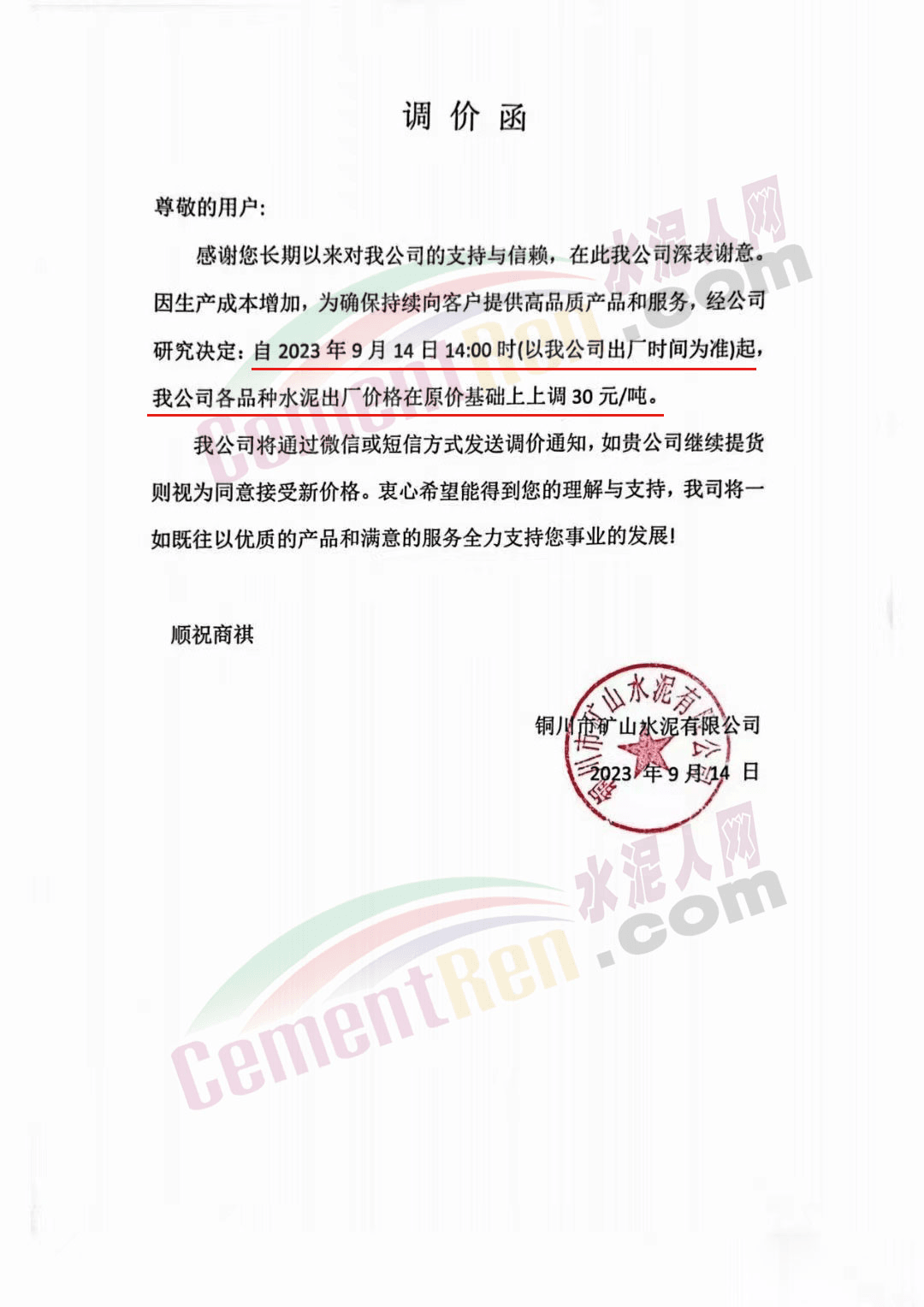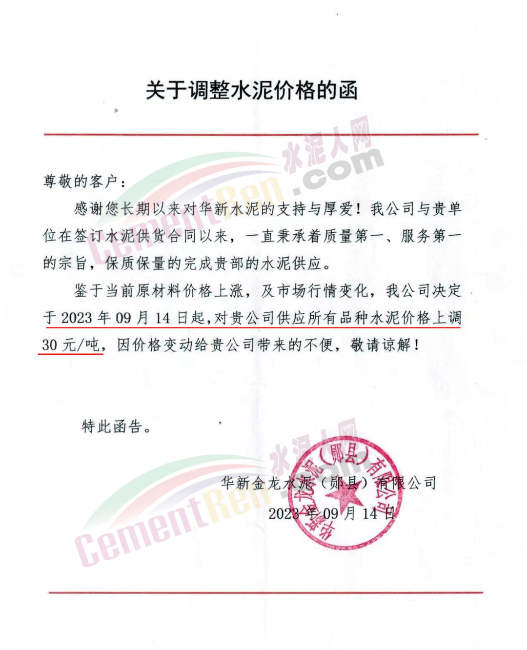 華新金龍水泥(鄖縣)有限公司通知,鑒于當前原材料價格上漲,及市場行情變化,公司決定于2023年9月14日起所有品種水泥價格上調30元/噸。