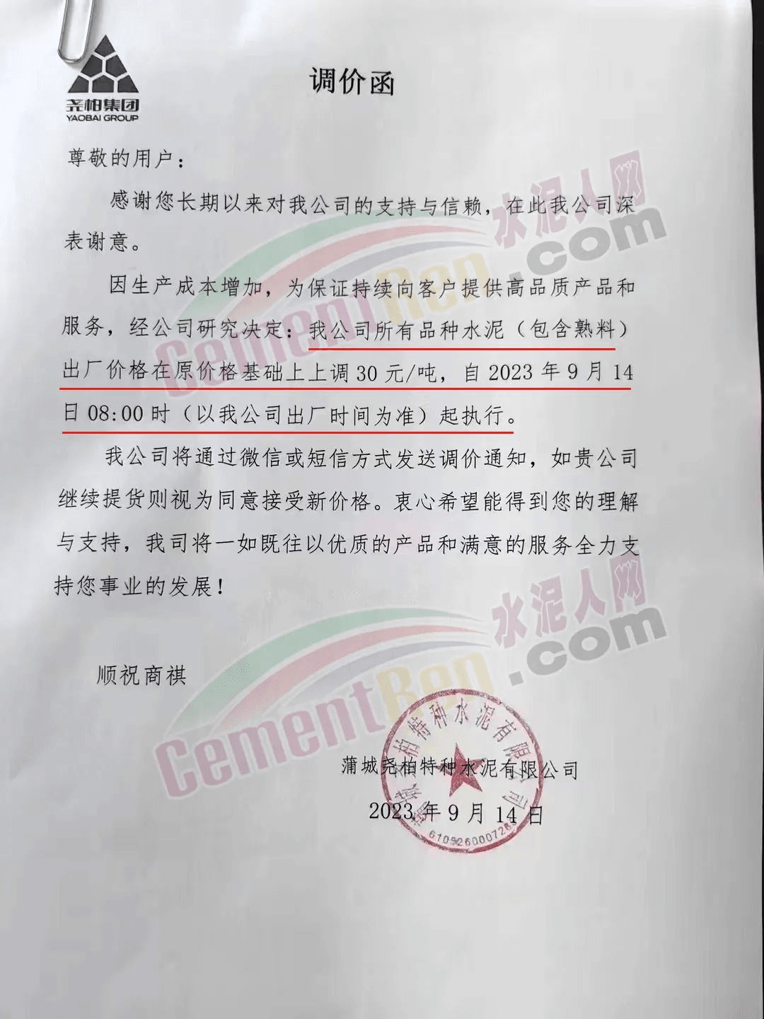 日前,遼寧喀左叢元號水泥有限責任公司通知,鑒于目前,原材料價格持續上漲,造成熟料生產成本大幅上漲。經公司研究決定,自2023年9月15日8時起,喀左公司熟料銷售價格在原價格的基礎上上調 20 元/噸。據水泥人網此前消息,該企業曾于9月8日上調熟料報價10元/噸,兩次累計上調30元/噸。