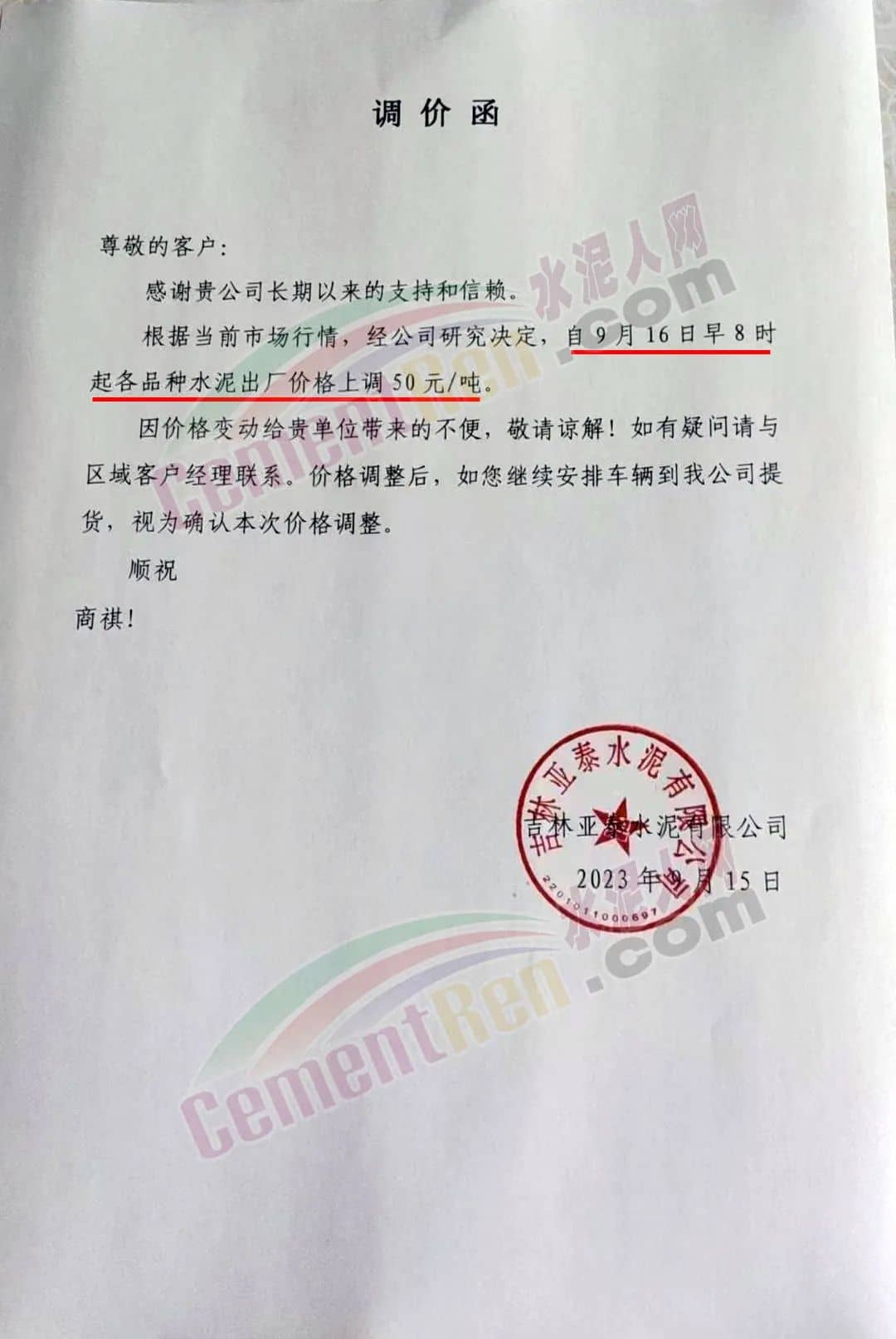 吉林亞泰水泥有限公司、亞泰集團伊通水泥有限公司分別通知,根據當前市場行情,經公司研究決定,自9月16日早8時起各品種水泥出廠價格上調50元/噸。