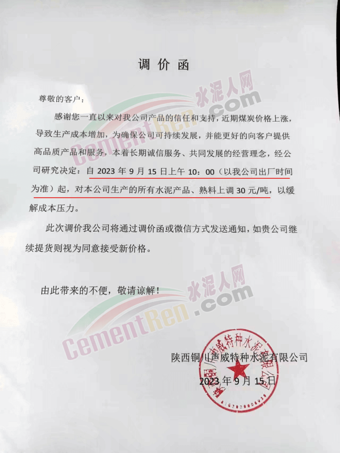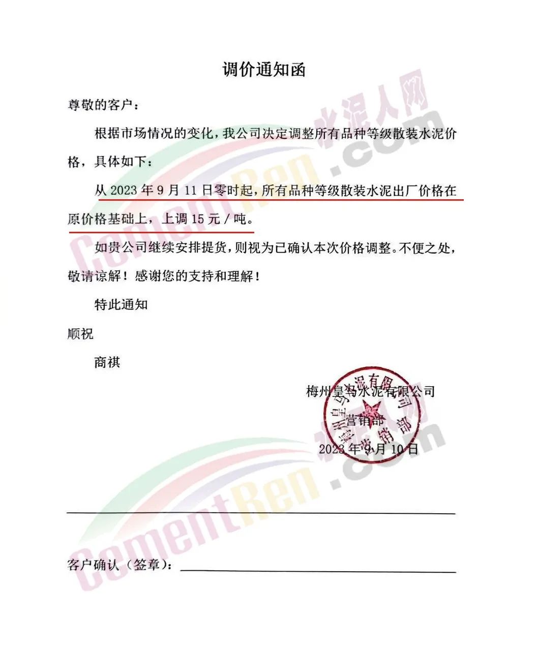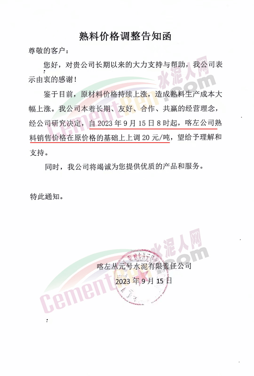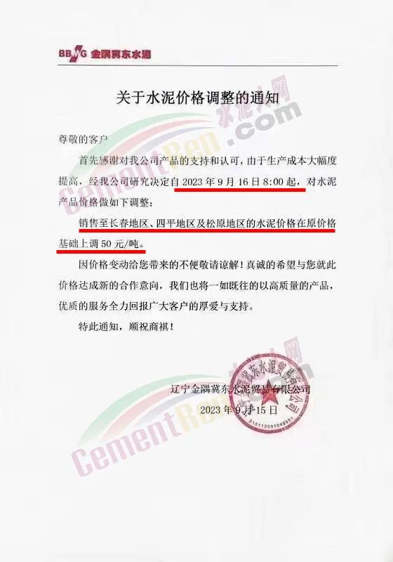 遼寧金隅冀東水泥貿易有限公司通知,由于生產成本大幅度提高,經公司研究決定自2023年9月16日8時起,對銷售至長春地區、四平地區及松原地區的水泥價格在原價格基礎上調50元/噸。