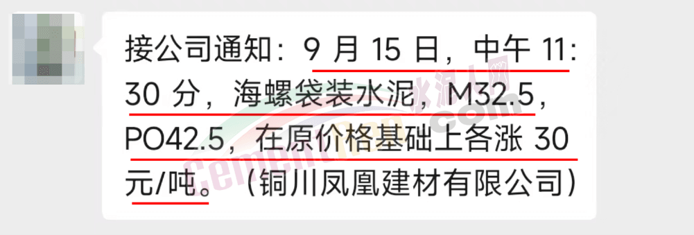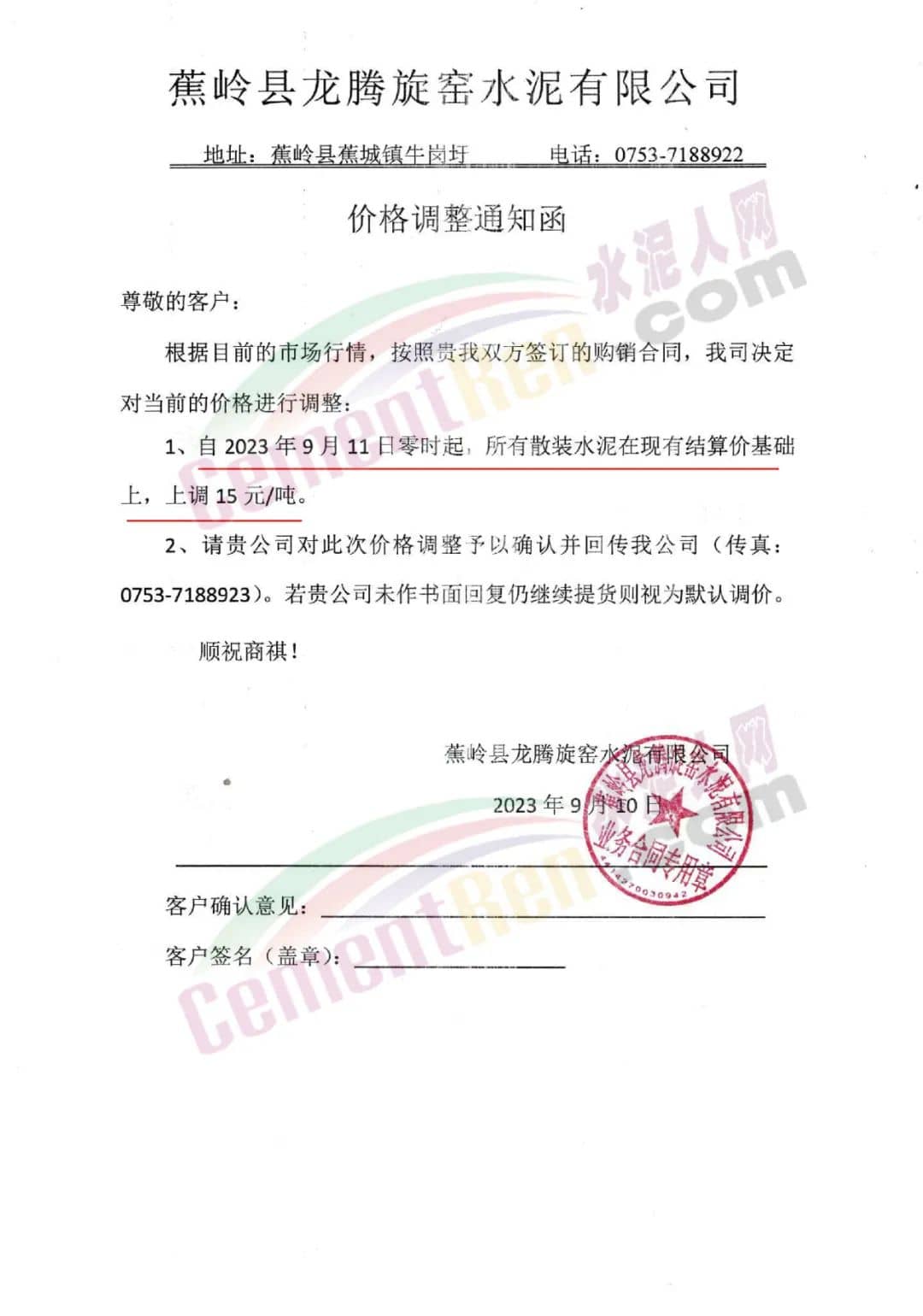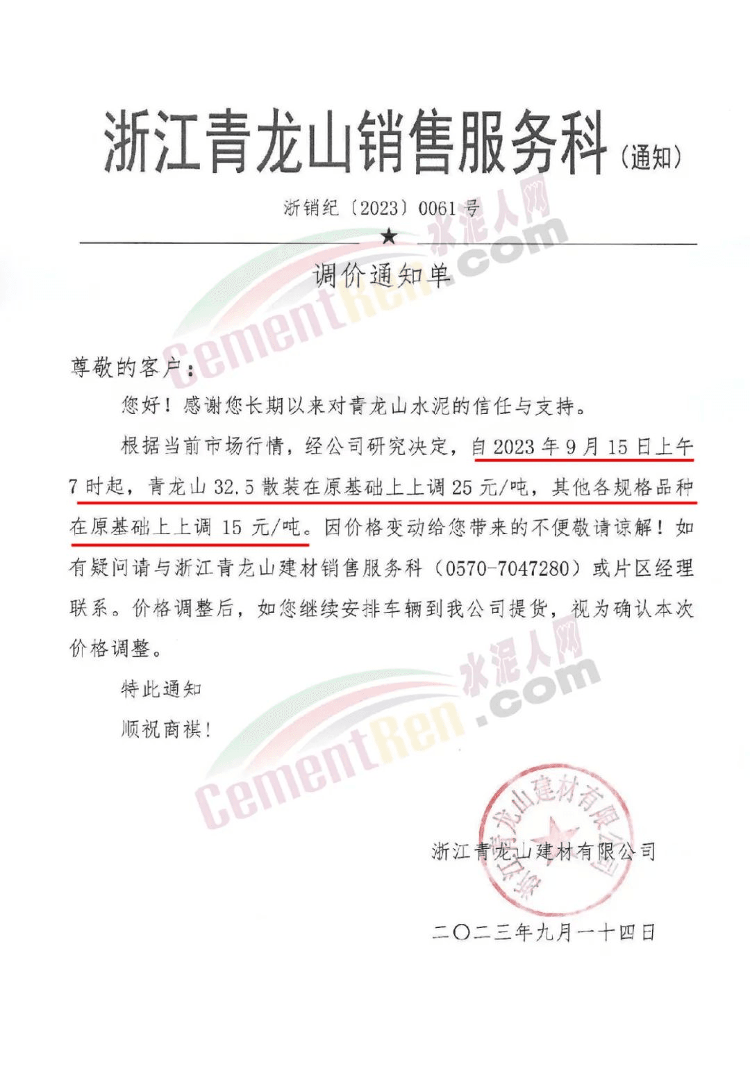 紅獅水泥旗下浙江青龍山水泥銷售服務科通知,自9月15日上午7時起,執行新價格。