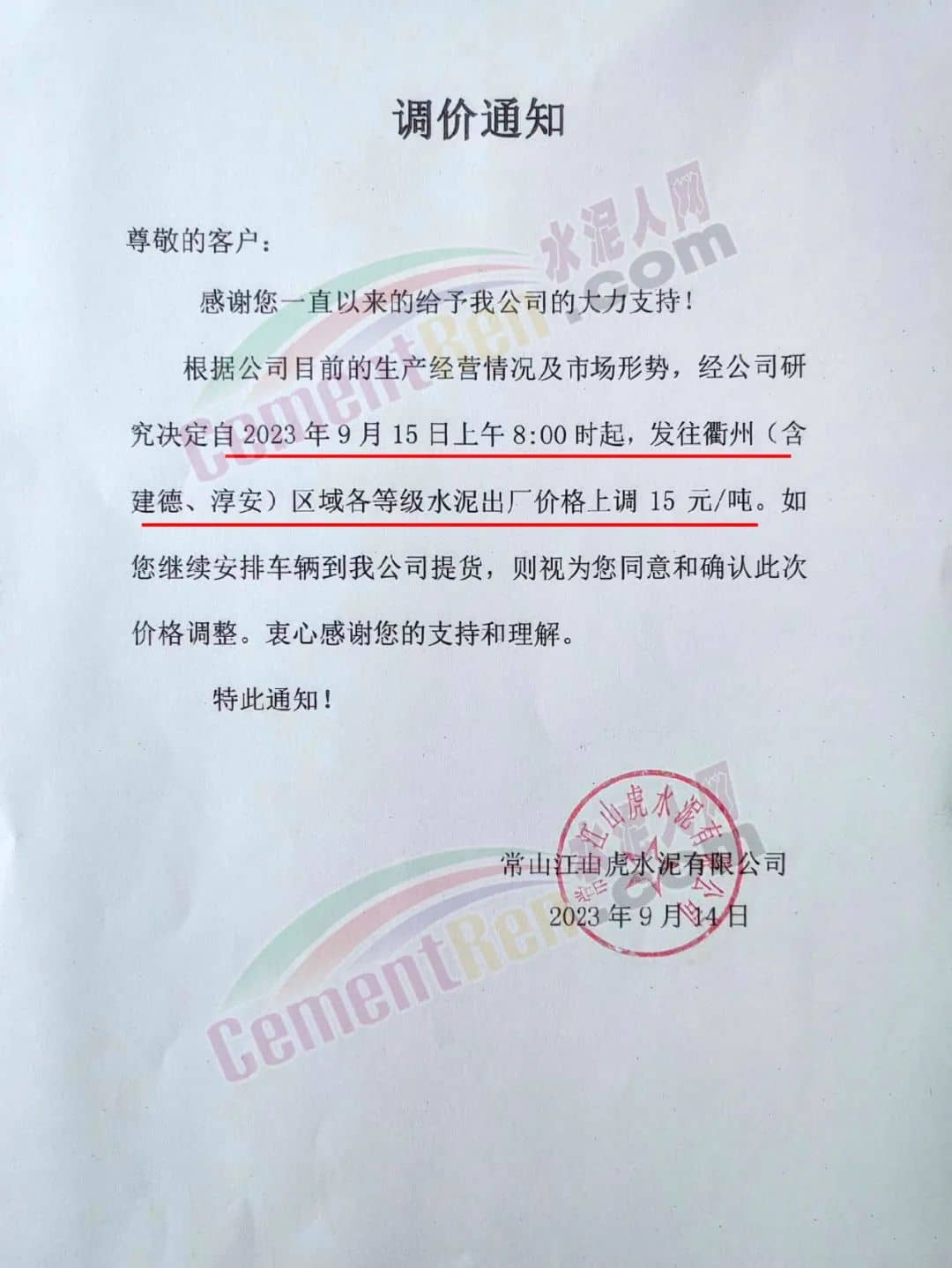 常山江山虎水泥有限公司通知,根據目前的生產經營情況及市場形勢,經公司研究決定從9月15日上午8時起,發往衢州(含建德、淳安)區域各等級水泥出廠價上調15元/噸。
