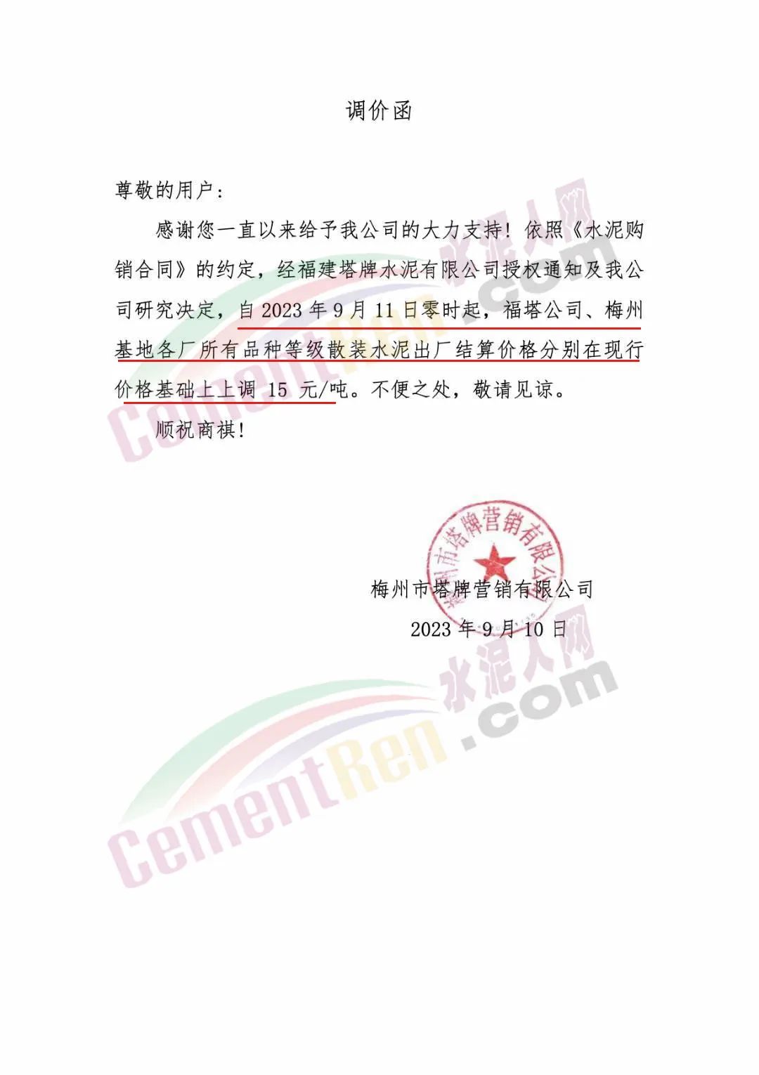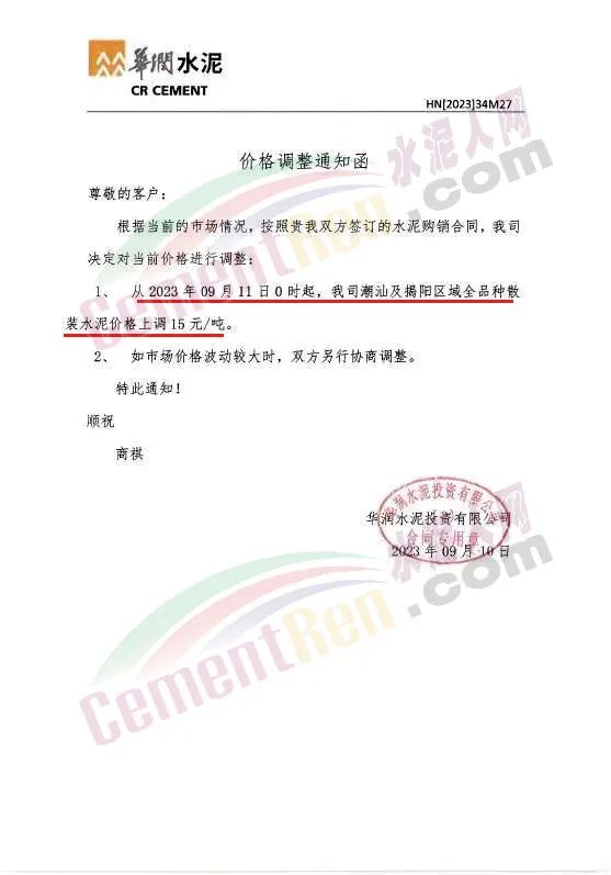 9月11日,廣東梅州、揭陽、潮汕多地包括華潤、塔牌等主要品牌在內的多家水泥企業通知水泥價格上調15元/噸。