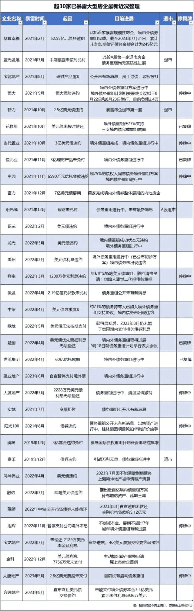 再有,房地產市場人均住房面積已經達到了較高水平。房企在下行周期中,頻頻爆雷。截至2023年8月24日,除在暴雷邊緣被“拉回”的碧桂園及遠洋,已經有超過30家大型房地產企業暴雷。