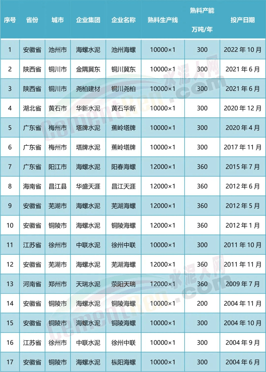 目前國內已建成投產10000t/d及以上生產線共17條,其中包含陜西銅川市惠塬工業園2021年6月新投產的冀東水泥和堯柏水泥的兩條萬噸線以及2022年10月建成投產的池州海螺10000t/d生產線。