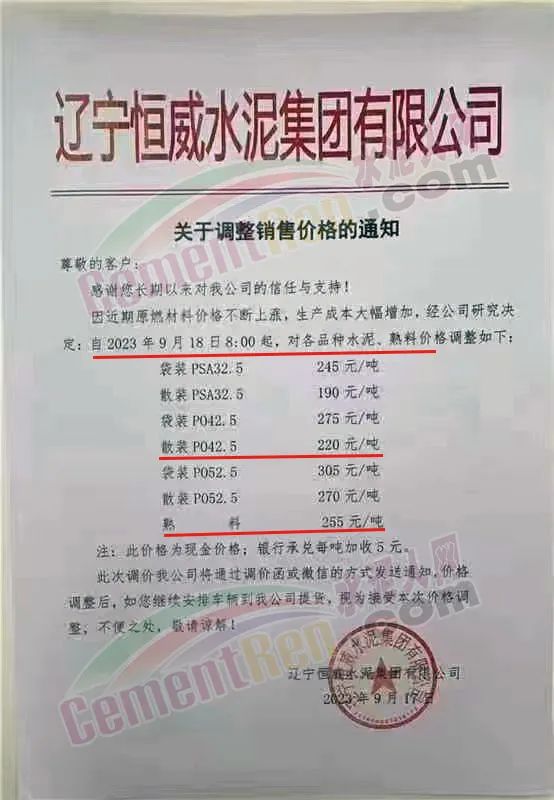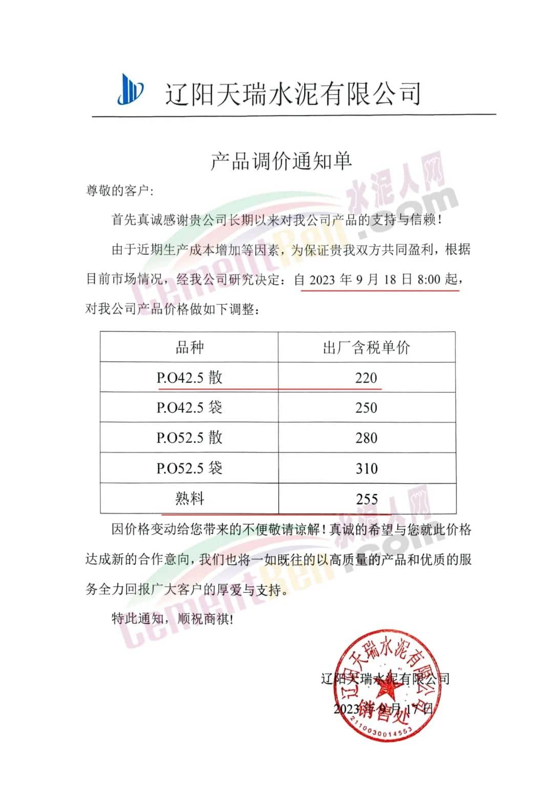 遼陽天瑞水泥有限公司通知,由于近期生產成本增加等因素,根據目前市場情況,經公司研究決定:自2023年9月18日8:00起執行新報價。其中P.O42.5散裝水泥出廠含稅報價220元/噸。熟料報價255元/噸。