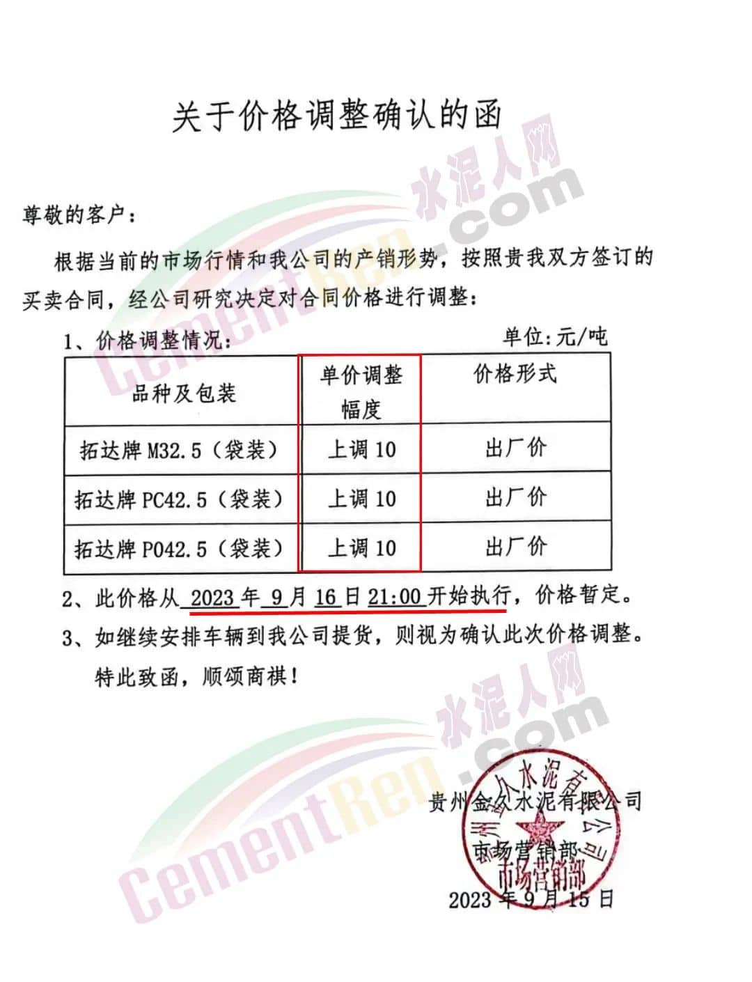 9月16日貴州金久水泥有限公司通知,各標(biāo)號(hào)袋裝水泥出廠價(jià)上調(diào)10元/噸。