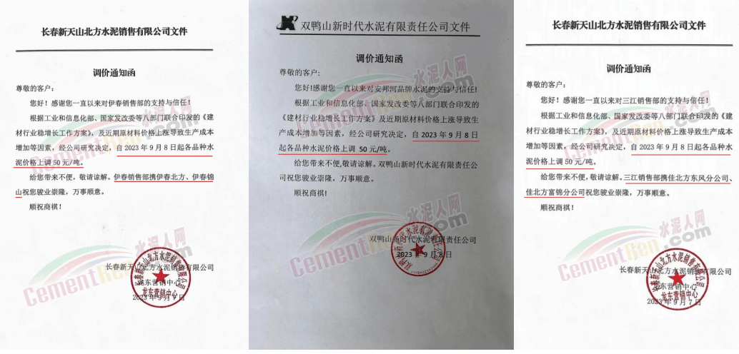 9月8日,雙鴨山新時(shí)代水泥、長(zhǎng)春新天山北方水泥龍東營(yíng)銷中心伊春銷售部、三江銷售部分別通知,各品種水泥價(jià)格上調(diào)50元/噸。