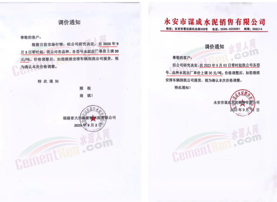 9月3日,占福建省熟料產(chǎn)能近60%,前五強(qiáng)的華潤(rùn)水泥、福建水泥、紅獅水泥、金牛水泥、龍麟集團(tuán)等10多家企業(yè)陸續(xù)通知全省熟料及各品種水泥價(jià)格上調(diào)30元/噸。