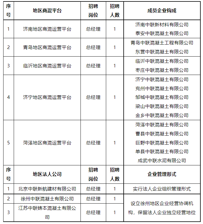 中國建材旗下華東材料有限公司華東地區商混運營平臺及法人公司總經理招聘,每個崗位招1人。
