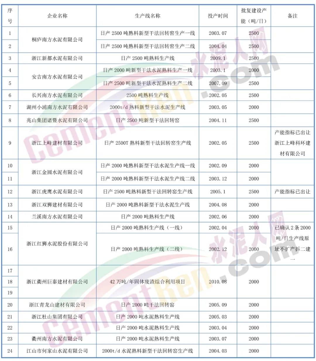 浙江紅獅水泥股份有限公司已確認兩條2000t/d生產線原址不擴產拆二建一;浙江上峰建材有限公司日產2500噸熟料新型干法回轉窯生產線產能指標已出讓浙江上峰科環建材有限公司;浙江虎鷹水泥有限公司,日產2500噸熟料新型干法回轉窯生產線產能指標已出讓。