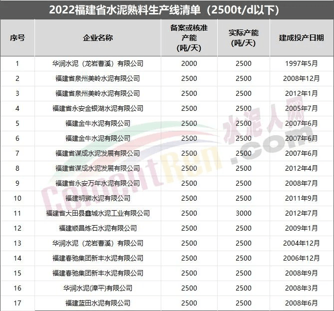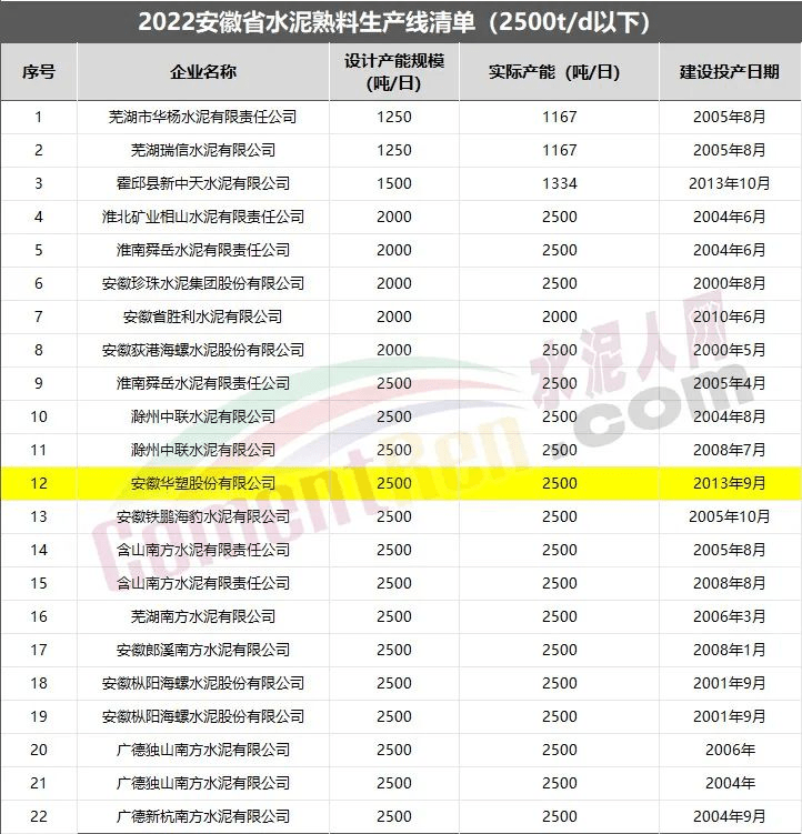 《浙江省水泥工業高質量發展暨碳達峰行動計劃(2022~2025年)》文件要求,研究落實2500t/d及以下水泥熟料生產線整合退出方案,省市縣合力分年度推進。2025年底前完成8條2500t/d及以下熟料生產線減量置換、兼并重組和原廠址拆建。浙江工信廳公布截至2022年底熟料生產線清單顯示: