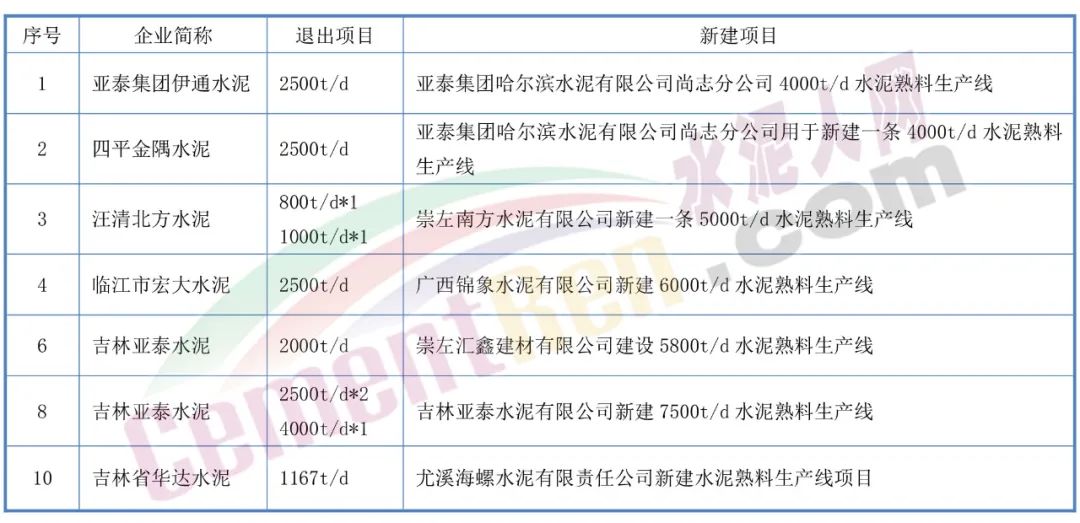 另據了解,今年4月中旬,吉林省工信廳公布水泥熟料生產線清單顯示,9條2500t/d及以下水泥熟料生產線已通過產能置換出讓,退出項目將隨著新建線投產逐步退出。