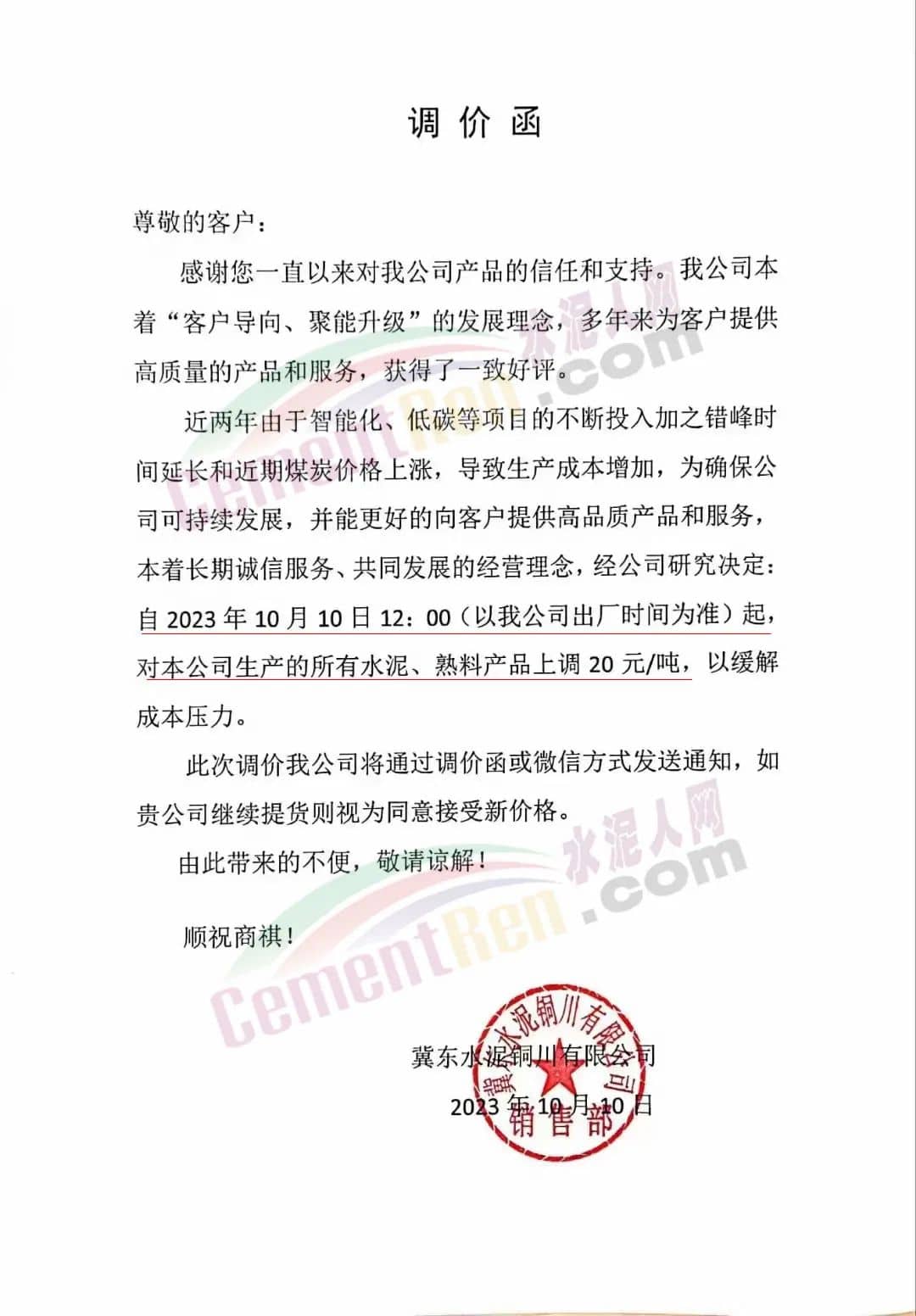 冀東水泥銅川有限公司、冀東海德堡(涇陽)水泥有限公司通知稱,近兩年由于智能化、低碳等項(xiàng)目的不斷投入加之錯(cuò)峰時(shí)間延長和近期煤炭價(jià)格上漲,導(dǎo)致生產(chǎn)成本增加,為確保公司可持續(xù)發(fā)展,并能更好地向客戶提供高品質(zhì)產(chǎn)品和服務(wù),本著長期誠信服務(wù)、共同發(fā)展的經(jīng)營理念,經(jīng)公司研究決定自2023年10月10日12時(shí)起,對(duì)本公司生產(chǎn)的所有水泥、熟料產(chǎn)品上調(diào)20元/噸,以緩解成本壓力。