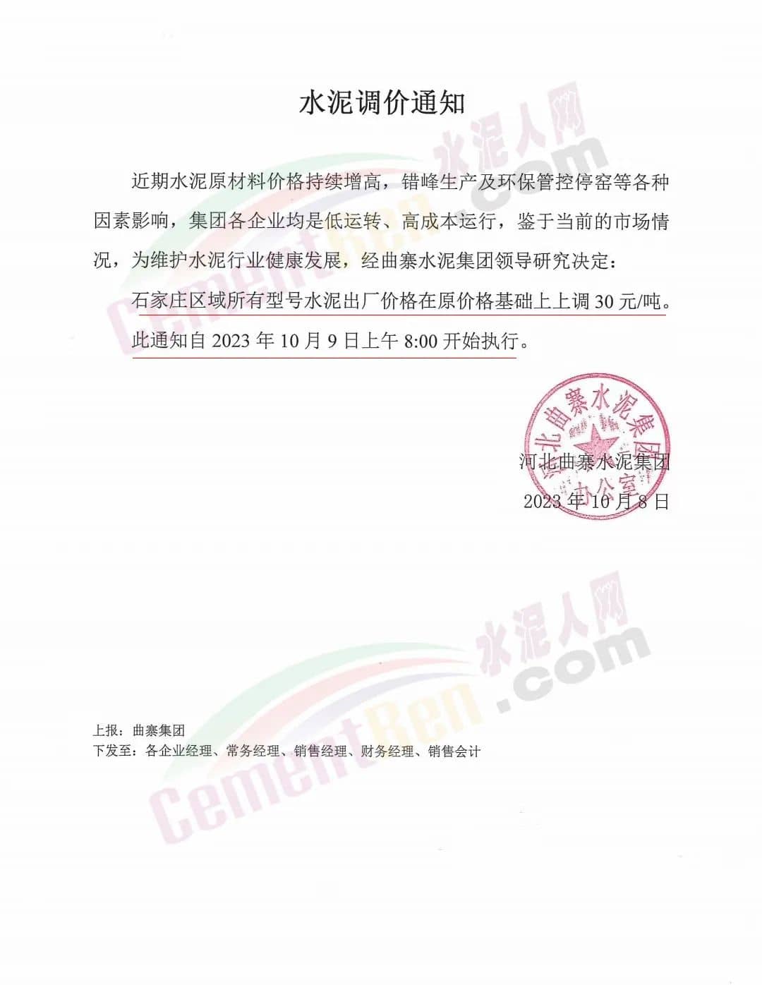 河北曲寨水泥集團(tuán)通知,近期水泥原材料價(jià)格持續(xù)增高,錯(cuò)峰生產(chǎn)及環(huán)保管控停窯等各種因素影響,集團(tuán)各企業(yè)均是低運(yùn)轉(zhuǎn)、高成本運(yùn)行,鑒于當(dāng)前的市場情況,為維護(hù)水泥行業(yè)健康發(fā)展,經(jīng)曲寨水泥集團(tuán)領(lǐng)導(dǎo)研究決定,自2023年10月9日上午8時(shí)起,石家莊區(qū)域所有型號(hào)水泥出廠價(jià)格在原價(jià)格基礎(chǔ)上上調(diào)30元/噸。