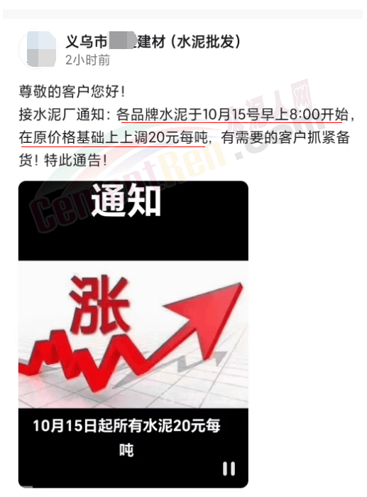 日前,浙江義烏市一水泥批發商發通知給客戶稱:接水泥廠通知,各品牌水泥于10月15日早上8時上調20元/噸,有需要的客戶抓緊備貨。