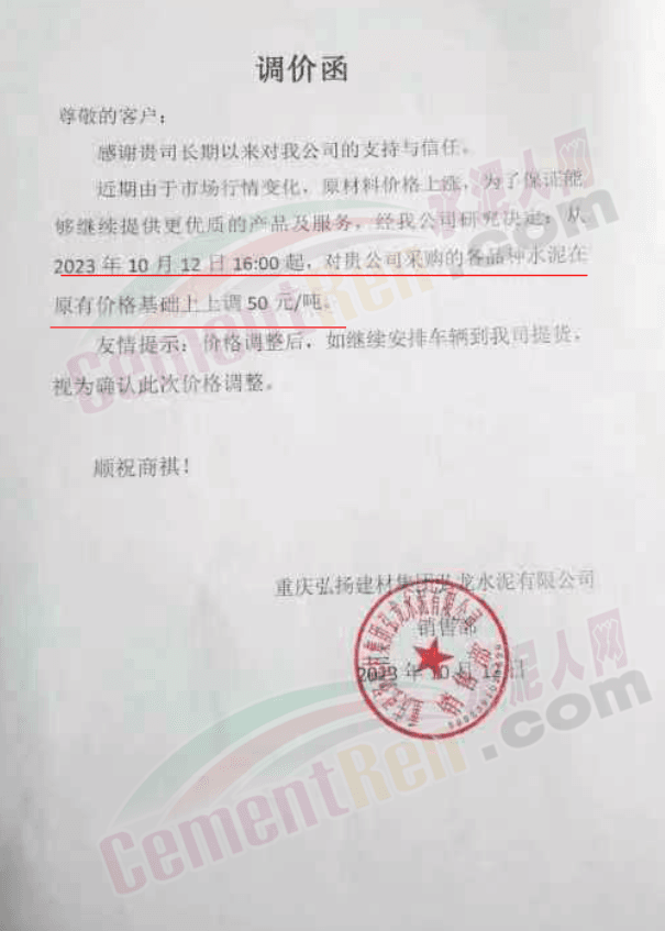 重慶弘揚建材集團衛龍水泥有限公司通知稱,近期由于市場行情變化,原材料價格上漲,為了保證能夠繼續提供優質的產品及服務,經公司研究決定,從10月12日16時起,對公司采購的各品種水泥在原有價格基礎上上調50元/噸。