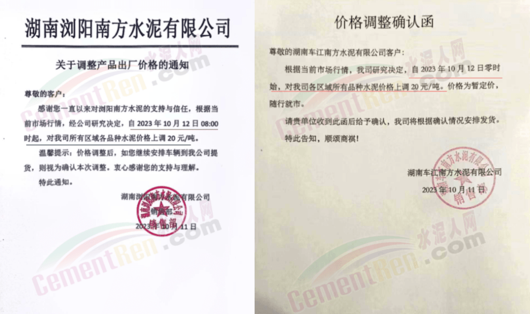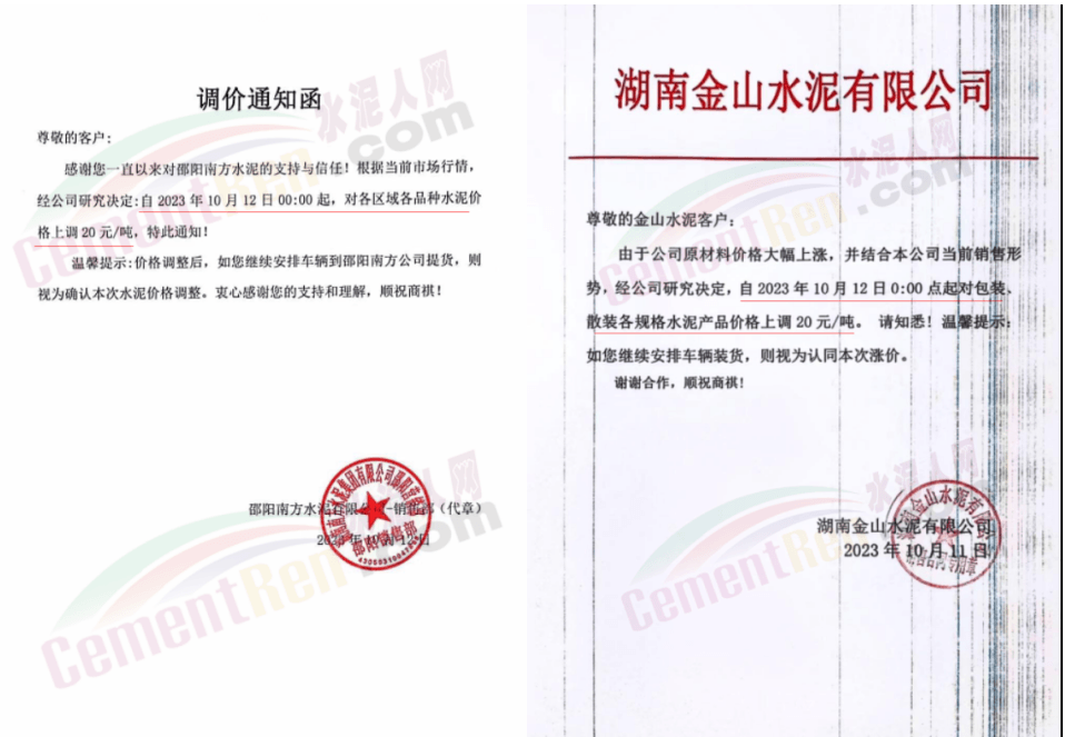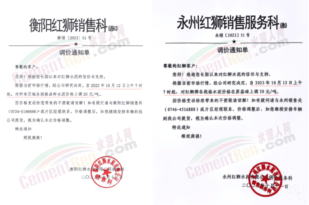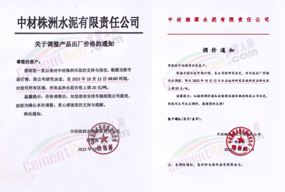 湖南區域中材株洲、中材湘潭、瀏陽南方、車江南方、邵陽南方、華新水泥株洲公司、華新水泥冷水江公司、衡陽紅獅、永州紅獅、金山水泥、恒宇建材、湘潭鑫達新材料等企業通知,所有區域、所有品種水泥價格12日起上調20元/噸。