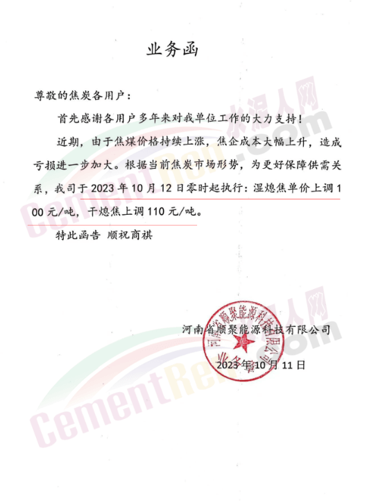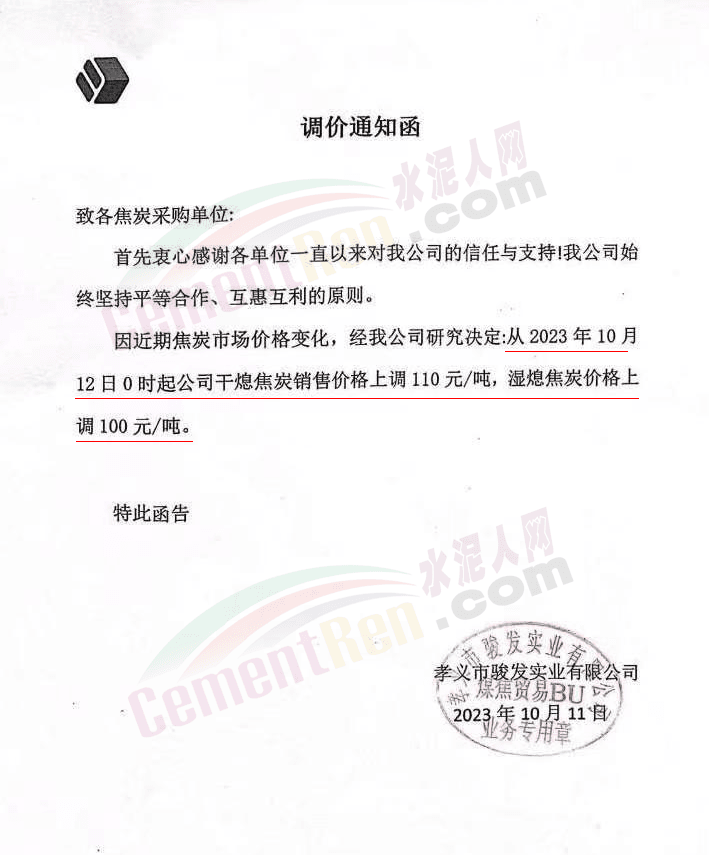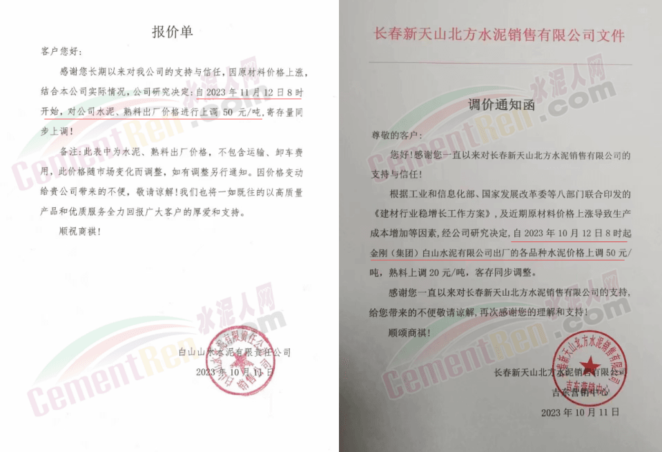 遼寧某混凝土企業通知,因水泥漲價,混凝土報價上調10元/噸。