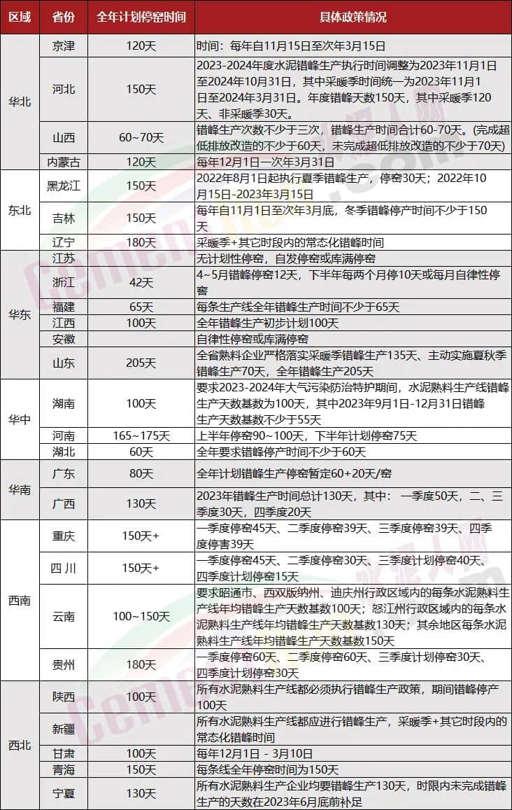 山西省,要求水泥行業2023年11月15日至2024年3月15日,全年合計錯峰停窯180~190天。