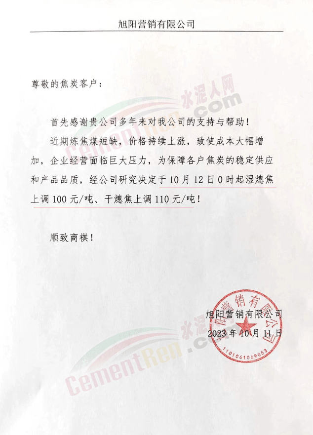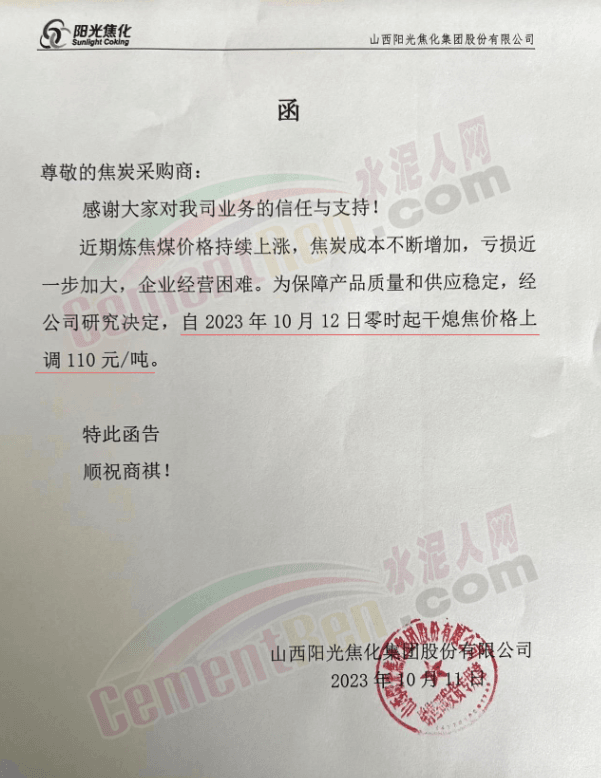12日,多家焦煤企業通知,焦炭價格上調110元/噸。