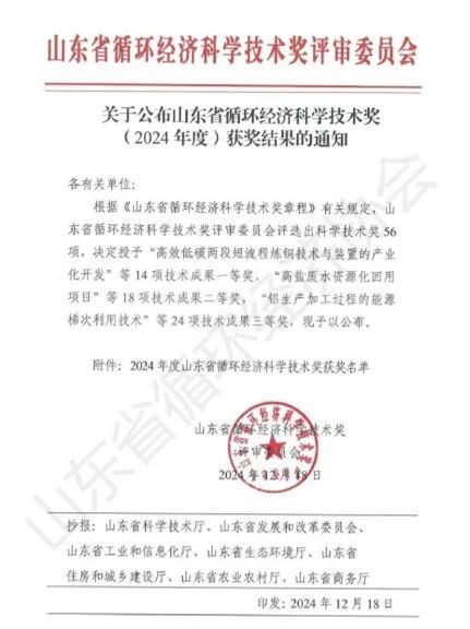 12月18日,中材礦山所屬南京礦山萊蕪分公司與山東魯碧集團有限公司、山東理工大學聯合申報的《小上峪石灰巖礦高質量綠色發展研究與應用》項目榮獲2024年度山東省循環經濟科學技術獎二等獎。此次獲獎,不僅是對南京礦山在科研創新能力的認可,也充分證明了公司在建設資源節約型、環境友好型企業方面所取得的顯著成就。
