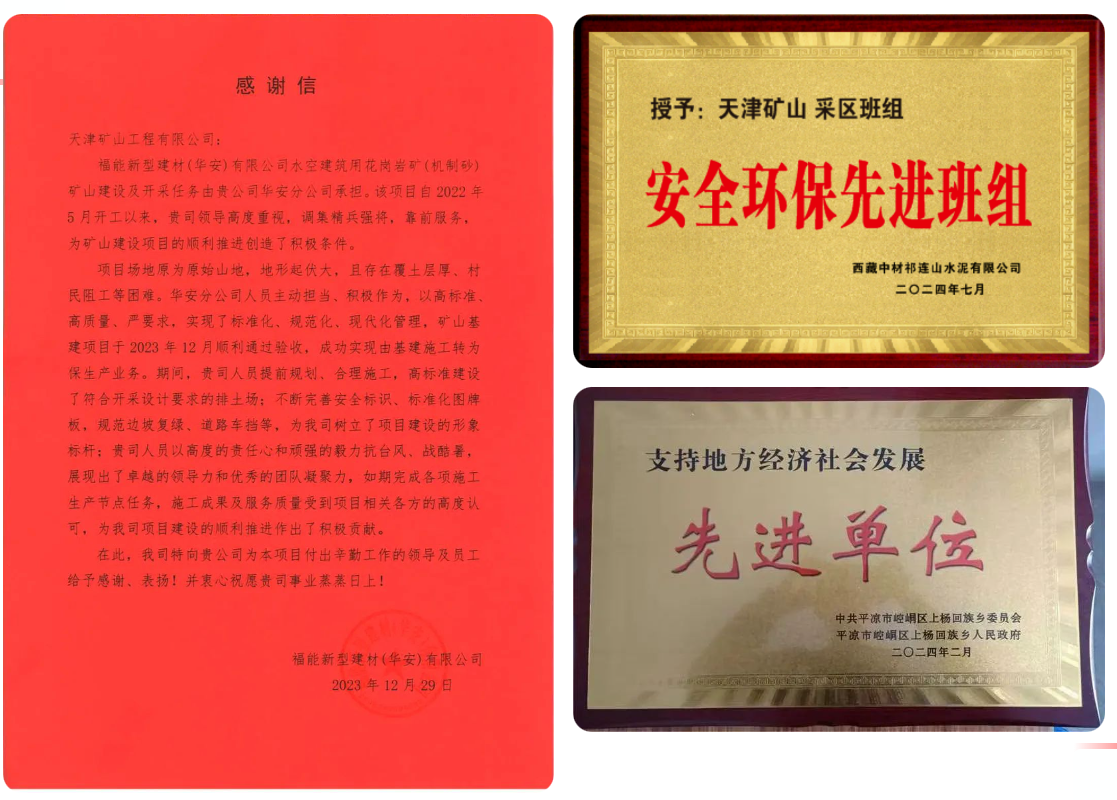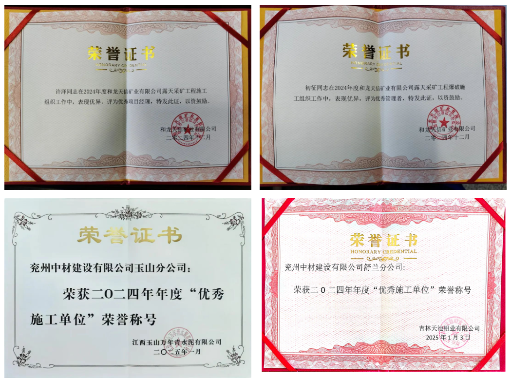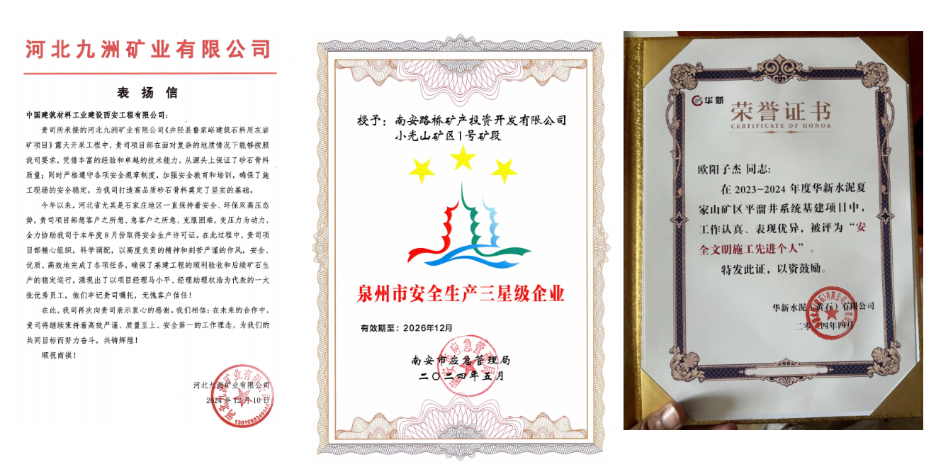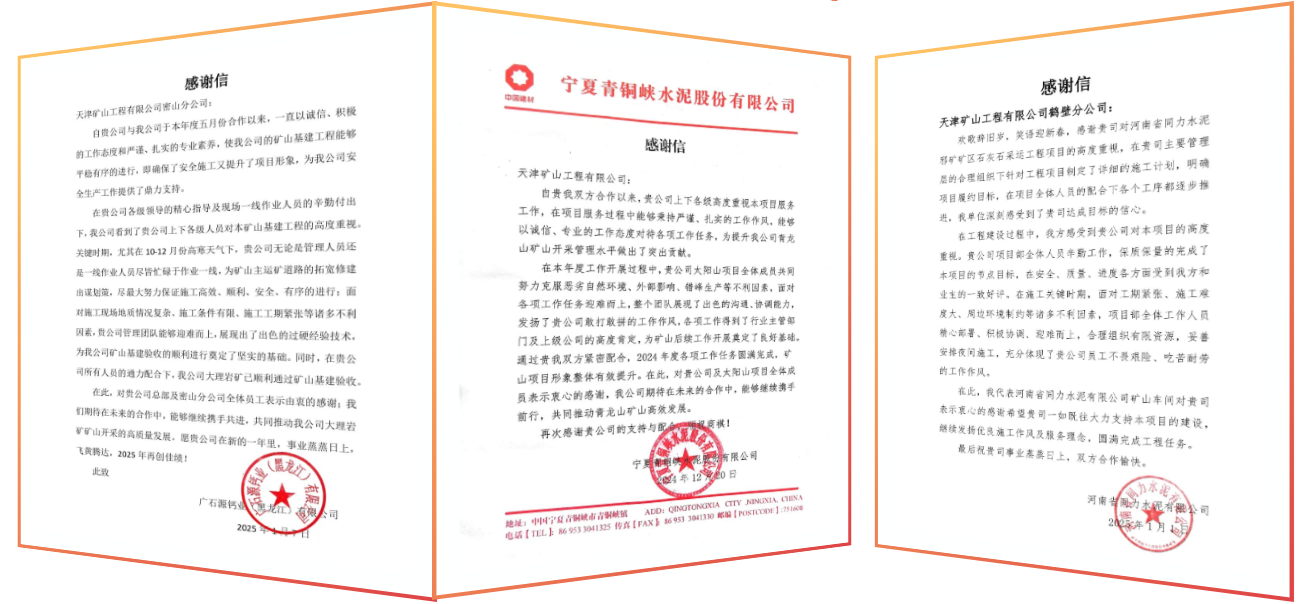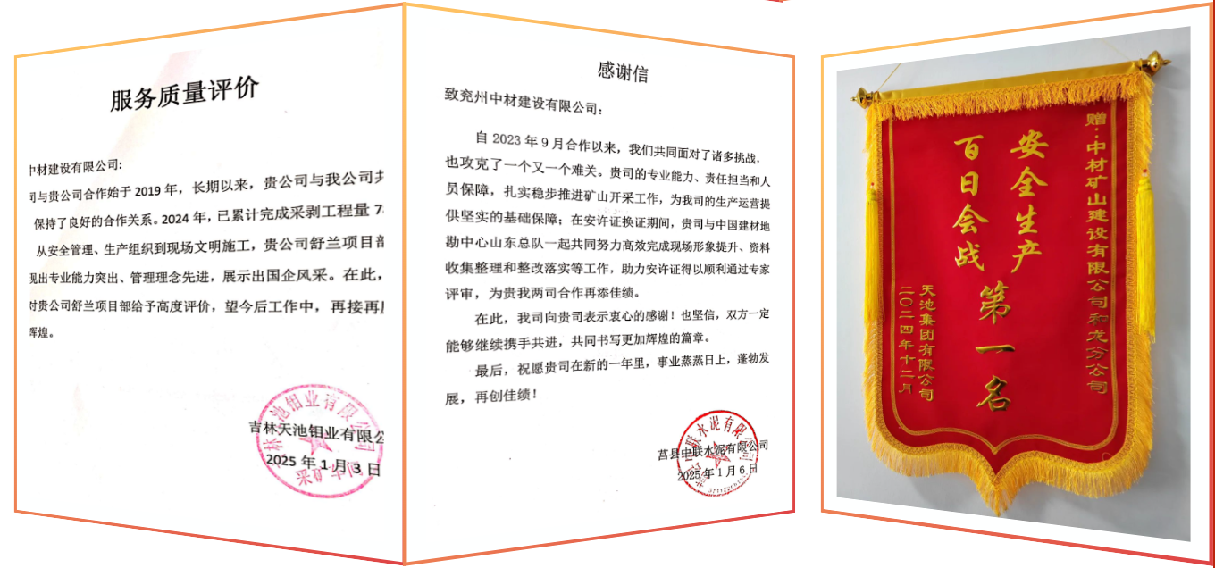 新年伊始,中材礦山各所屬公司收到了來自多方業主的表彰和感謝信。這不僅是對我們過去工作的肯定,更是對我們未來的激勵。我們始終秉持著專業、負責的態度,發揚礦山人精神,努力為業主提供優質的服務。