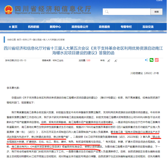 而在2022年5月13日,四川省經濟和信息化廳發布【四川省經濟和信息化廳對省十三屆人大第五次會議《關于支持革命老區利用優勢資源啟動南江海螺水泥項目建設的建議》答復的函】稱:受有關政策影響,南江海螺水泥產能置換項目無法落地建設。