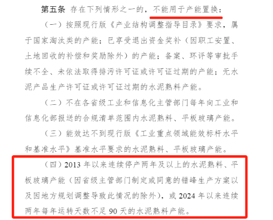 現行置換辦法第二章第五條規定:2013年以來連續停產兩年及以上的水泥熟料、平板玻璃產能(因省級主管部門制定或同意的錯峰生產方案以及因地方規劃調整導致此情況的除外),或2024年以來連續兩年每年運轉天數不足90天的水泥熟料產能。不能用于產能置換。
