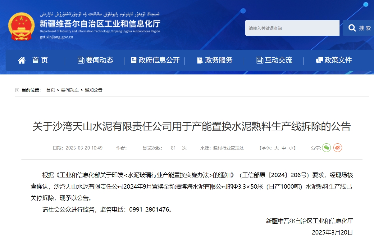 根據(jù)《工業(yè)和信息化部關(guān)于印發(fā)<水泥玻璃行業(yè)產(chǎn)能置換實(shí)施辦法>的通知》(工信部原〔2024〕206號(hào))要求,經(jīng)現(xiàn)場(chǎng)核查確認(rèn),沙灣天山水泥有限責(zé)任公司2024年9月置換至新疆博海水泥有限公司的Φ3.3×50米(日產(chǎn)1000噸)水泥熟料生產(chǎn)線(xiàn)已關(guān)停拆除,現(xiàn)予以公告。