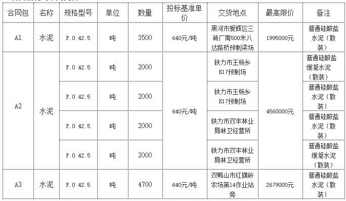 ②結算單價=以結算期內“中國水泥網(www.ccement.com)”公布的“黑龍江省哈爾濱地區水泥價格行情 ”中每日發布的天鵝、虎鼎、盾石三個品牌 P.O42.5 水泥散裝參考價(不含低堿水泥)算術平均值(四舍五入取整)-成交單價下浮金額。
