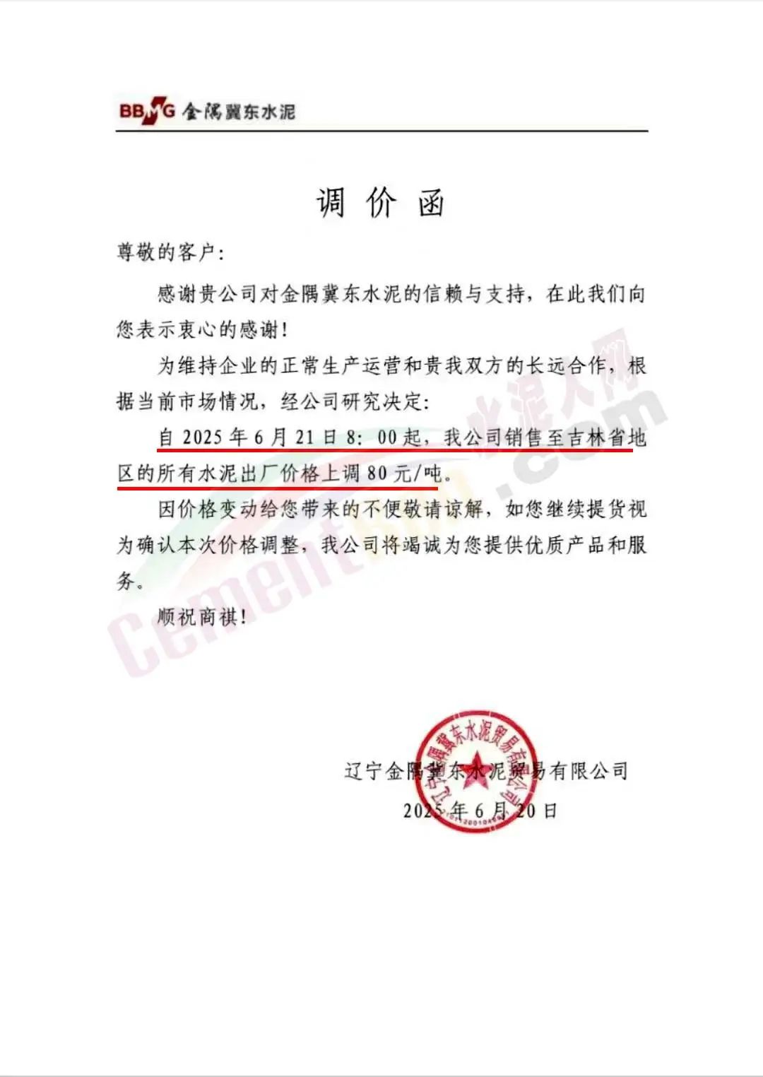 遼寧金隅冀東水泥貿(mào)易有限公司通知稱,為維持企業(yè)的正常生產(chǎn)運(yùn)營,根據(jù)當(dāng)前市場情況,經(jīng)公司研究決定,自2025年6月21日8時(shí)起,公司銷售至吉林省地區(qū)的所有水泥出廠價(jià)格上調(diào)80元/噸。