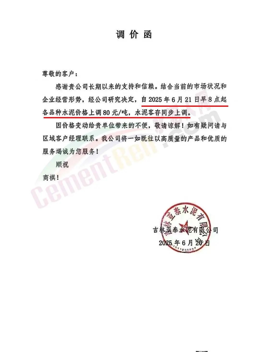 吉林亞泰鼎鹿水泥有限公司通知,結(jié)合當(dāng)前的市場狀況和企業(yè)經(jīng)營形勢,經(jīng)公司研究決定,自2025年6月21日早8點(diǎn)起各品種水泥價(jià)格上調(diào)80元/噸,水泥客存同步上調(diào)。