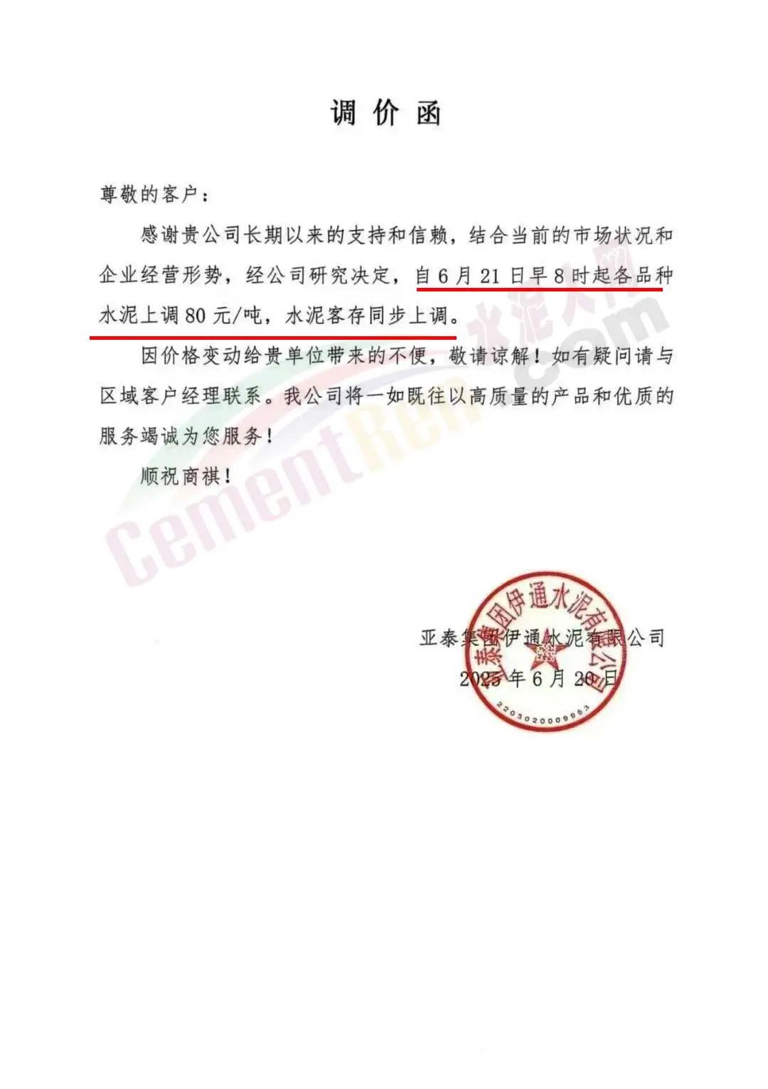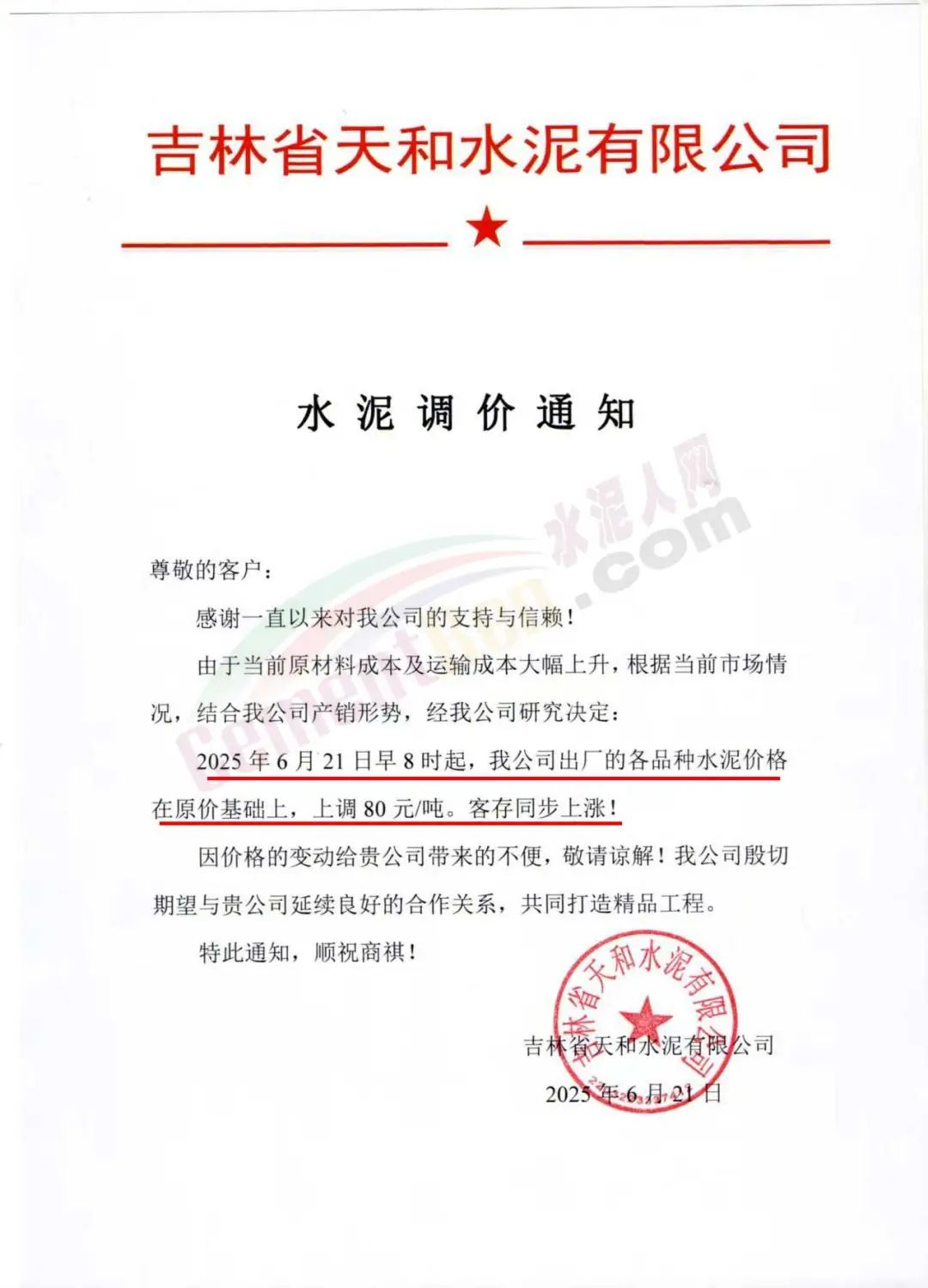 吉林天和水泥通知,自6月21日起,公司出廠的各品種水泥價(jià)格在原價(jià)基礎(chǔ)上上調(diào)80元/噸,客存同步上漲。