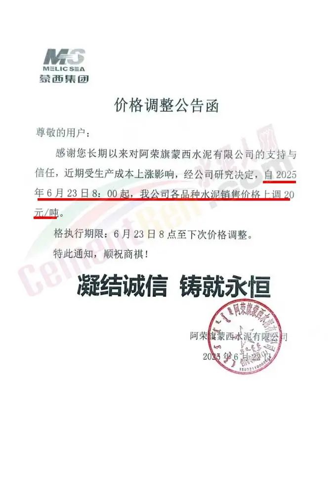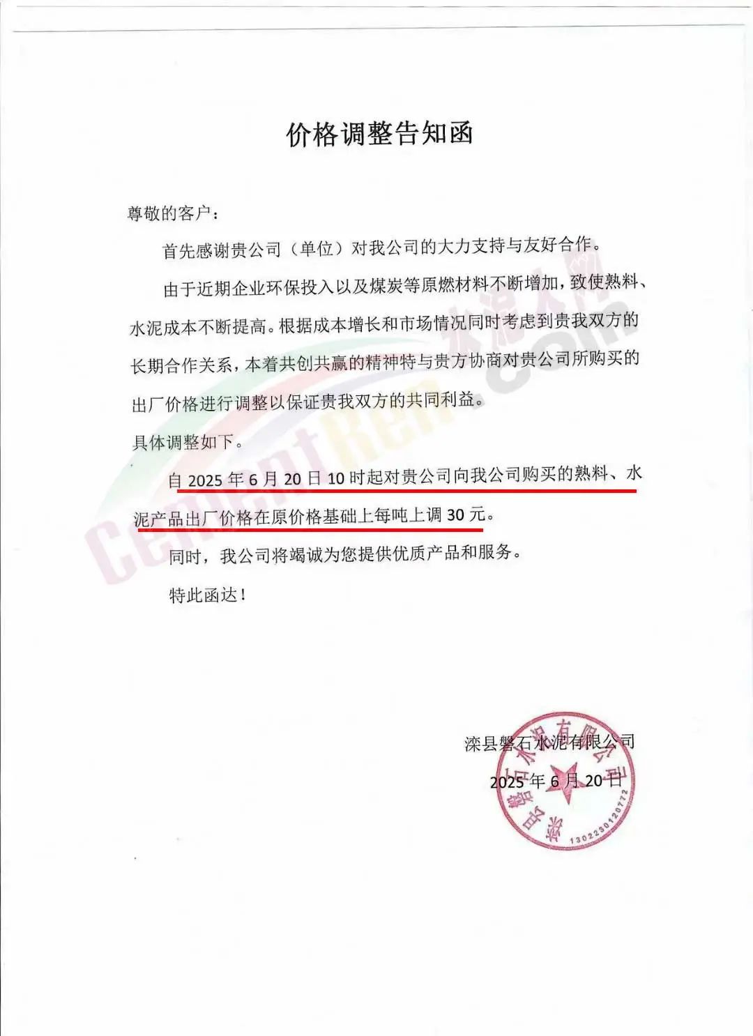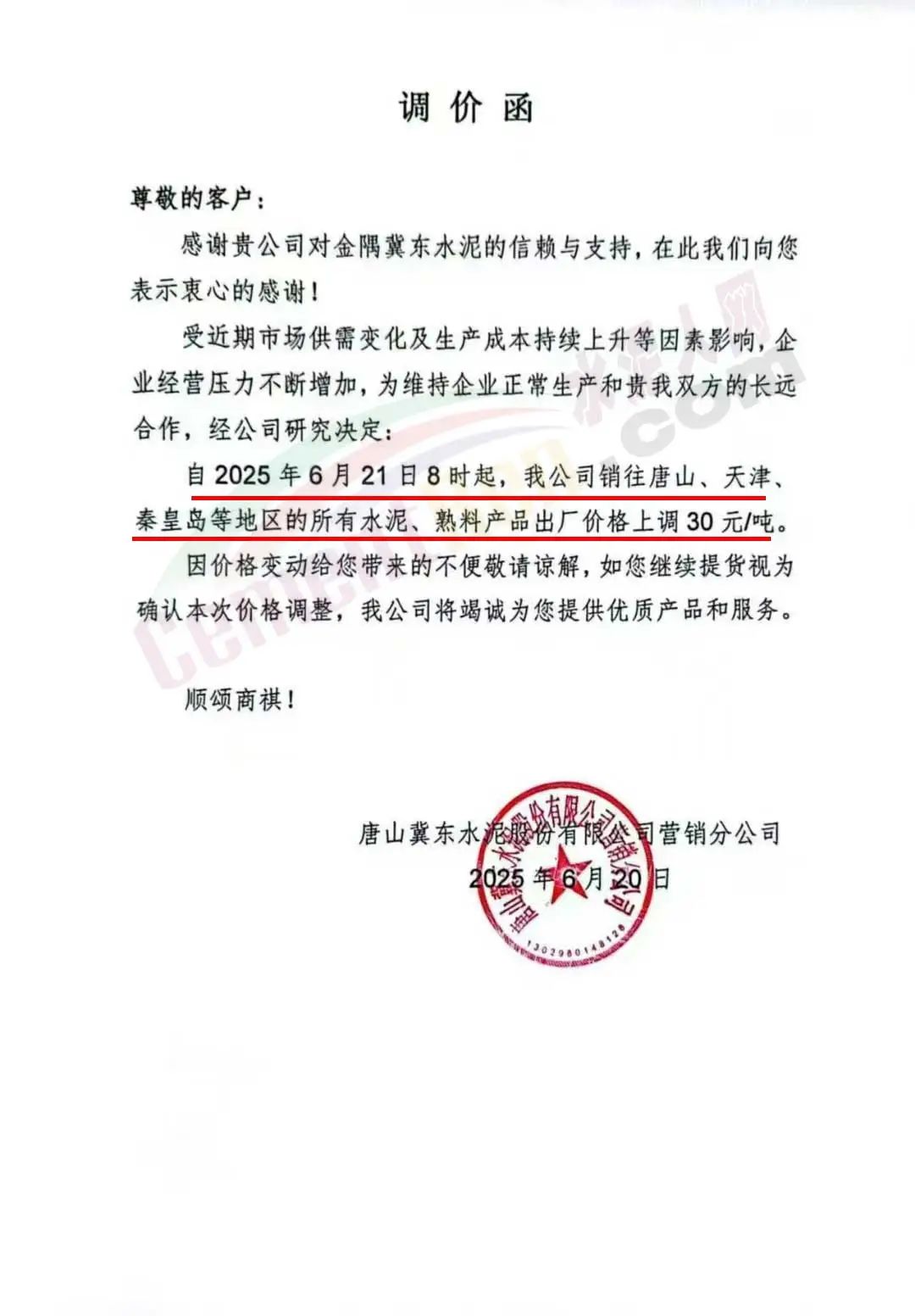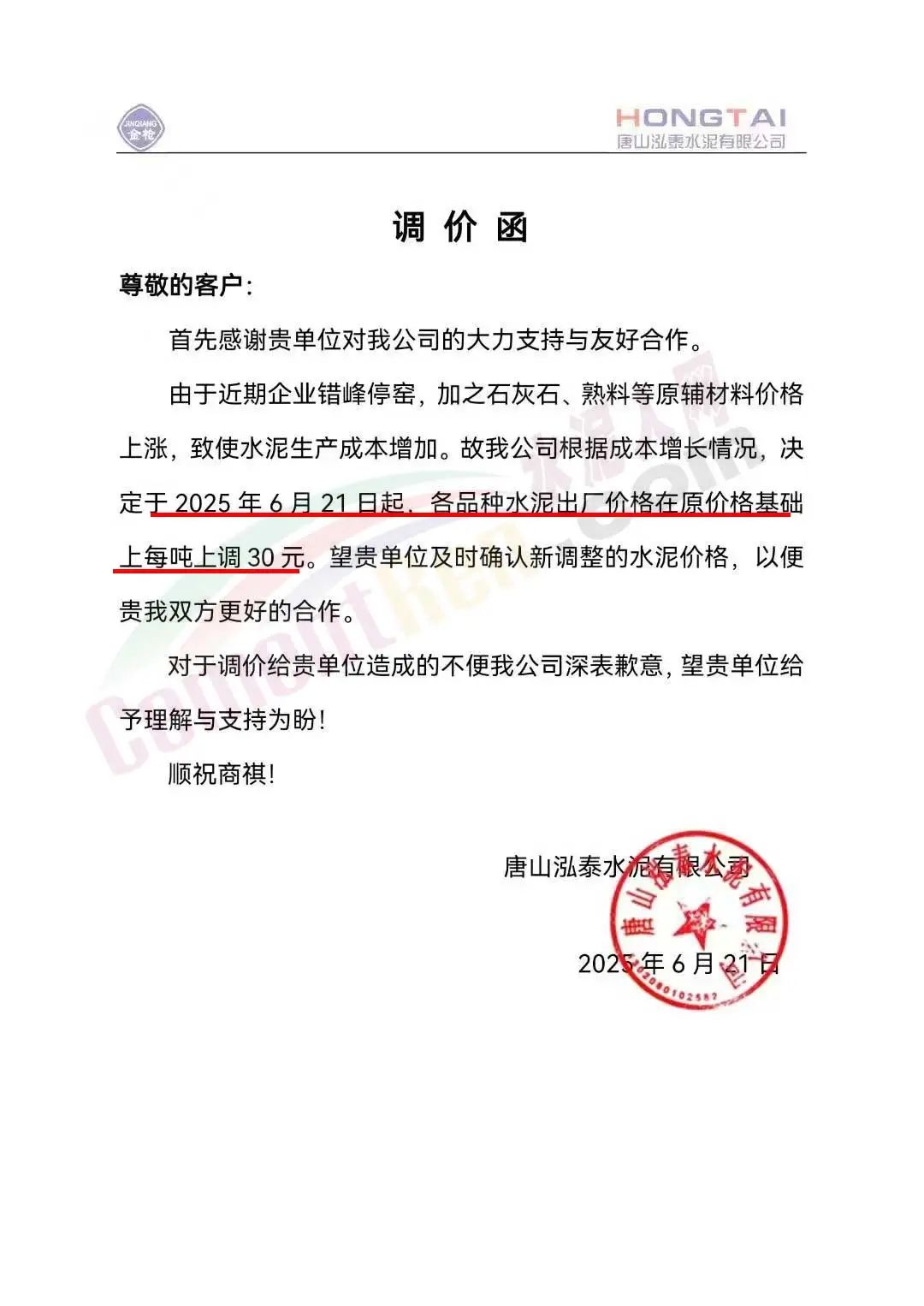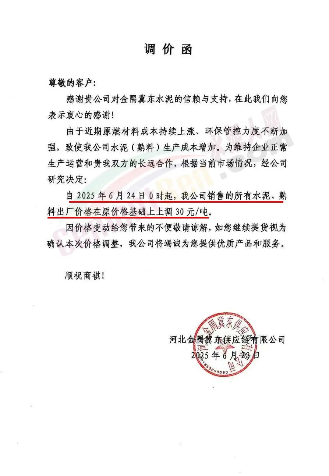 河北金隅冀東供應(yīng)鏈有限公司通知,近期原燃材料成本持續(xù)上漲、環(huán)保管控力度不斷加強(qiáng),致使我公司水泥(熟料)生產(chǎn)成本增加。為維持企業(yè)正常生產(chǎn)運(yùn)營和貴我雙方的長遠(yuǎn)合作,根據(jù)當(dāng)前市場情況,經(jīng)公司研究決定:自2025年6月24日0時(shí)起,公司銷售的所有水泥、熟料出廠價(jià)格在原價(jià)格基礎(chǔ)上上調(diào)30元/噸。