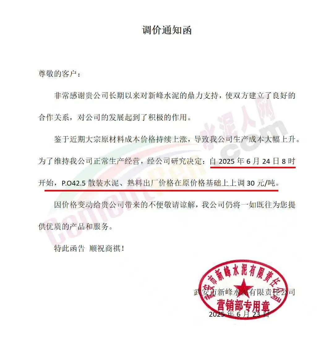 武安市新峰水泥有限責(zé)任公司通知,鑒于近期大宗原材料成本價(jià)格持續(xù)上漲,導(dǎo)致公司生產(chǎn)成本大幅上升,為了維持公司正常生產(chǎn)經(jīng)營,經(jīng)公司研究決定:自2025年6月24日8時(shí)開始,P.O42.5散裝水泥、熟料出廠價(jià)格在原價(jià)格基礎(chǔ)上上調(diào)30元/噸。